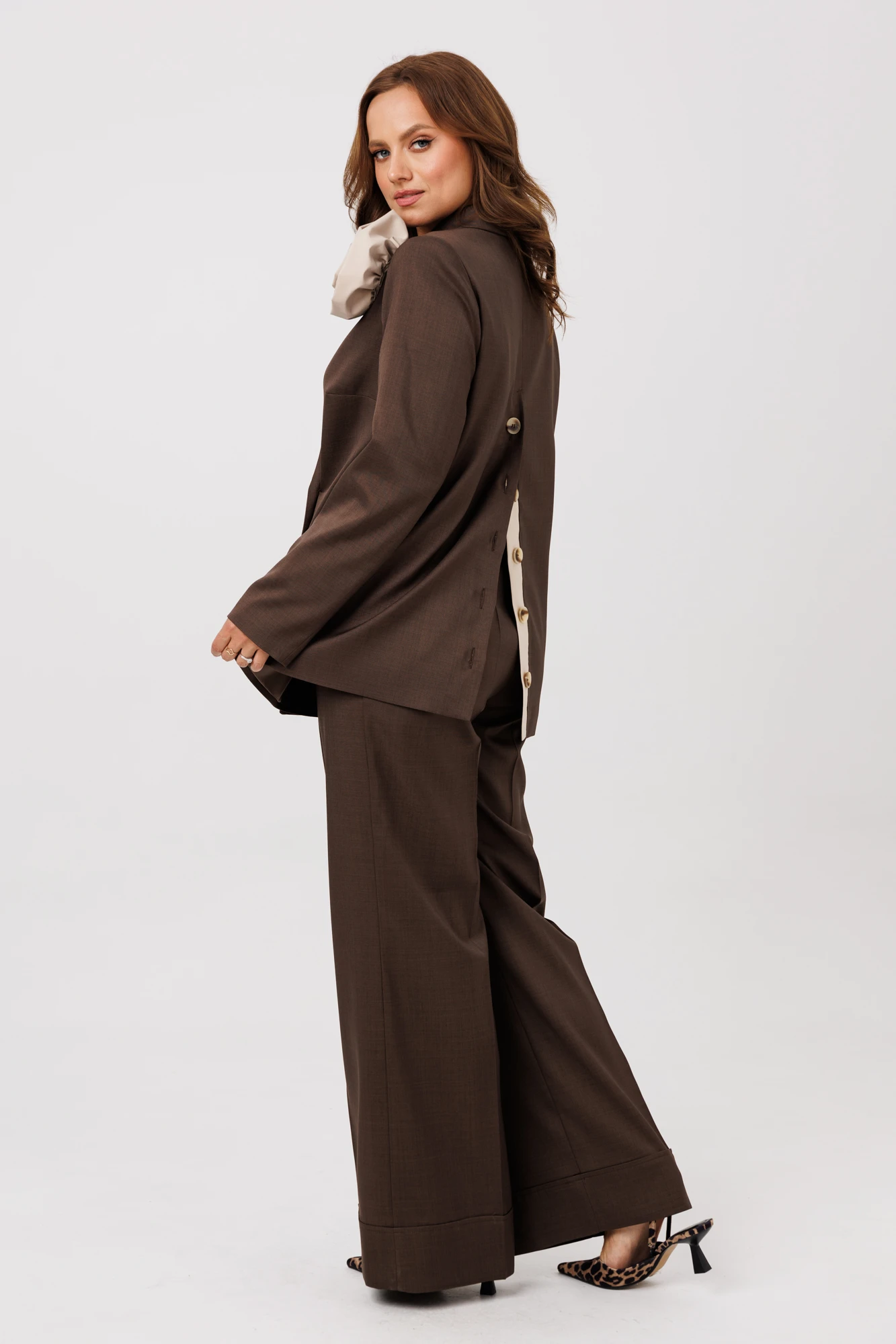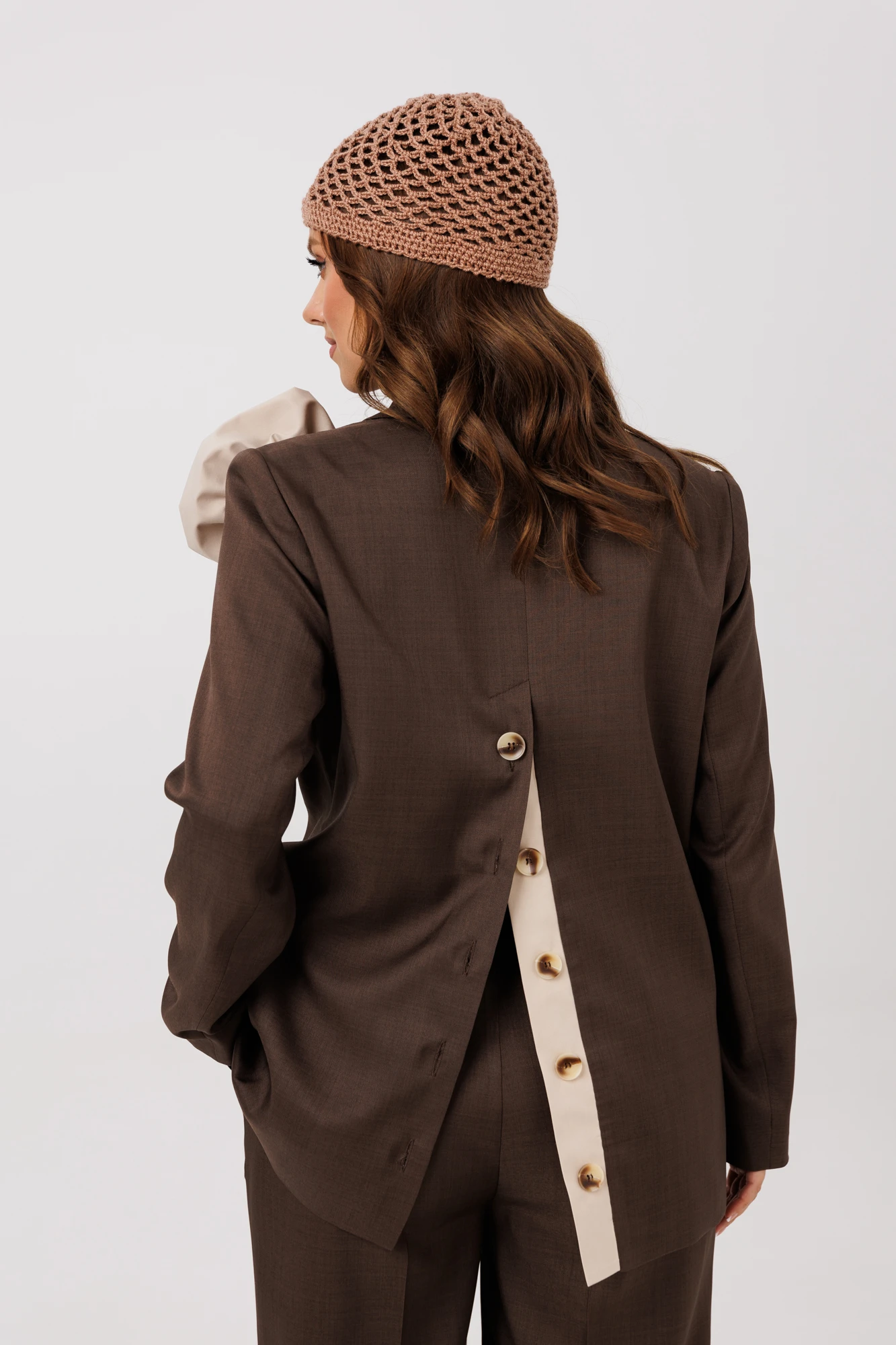 Жакет прямого кроя на подкладке. По переду нагрудные вытачки, функциональные карманы с листочкой, центральная двубортная застежка на петли-пуговицы. Горловина оформлена воротником пиджачного типа с лацканом. Спинка со средним швом, шлицей-планкой из отделочной ткани, застегивающейся на петли-пуговицы. Рукава втачные, двухшовные. Жакет декорирван съемным цветком из отделочной ткани.