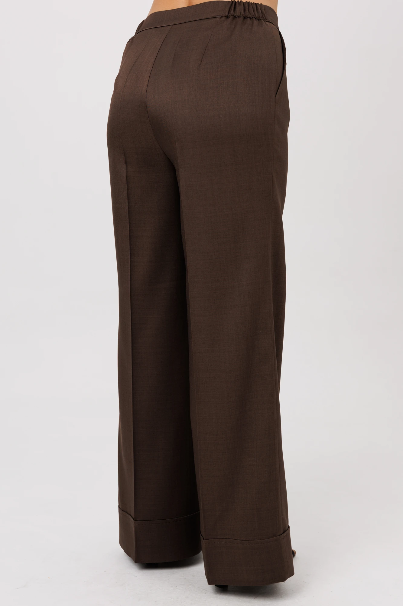 Брюки прямого, свободного кроя с высокой посадкой, с наклонными карманами в боковых швах, по срезу банта – застежка-молния. По передним половинкам талиевые вытачки. По низу брюк отрезные манжеты.
