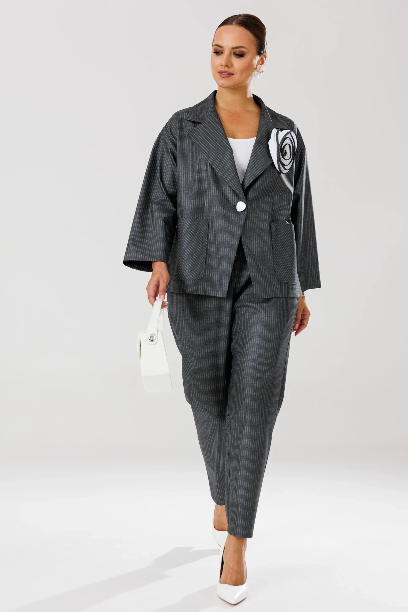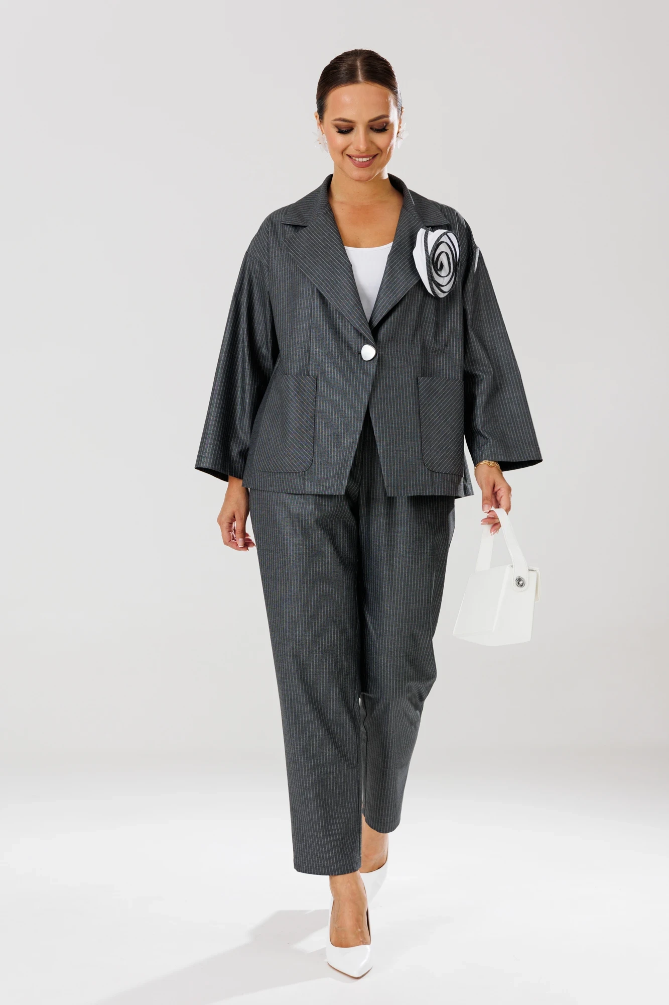 48, 50 ,52,54,56,58,60Жакет прямого силуэта со спущенной линией плеча. По переду нагрудная вытачка, накладные карманы, центральная застежка на одну петлю-пуговицу. Горловина оформлена воротником пиджачного типа с лацканом. Спинка со средним швом. Рукава одношовные, длиной 7/8. Жакет без подкладки, декорирован съемным цветком