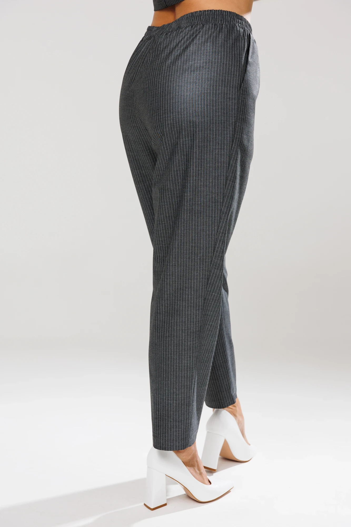 Брюки зауженные к низу с высокой посадкой. В боковых швах наклонные карманы. Верхний срез оформлен поясом с эластичной резинкой.