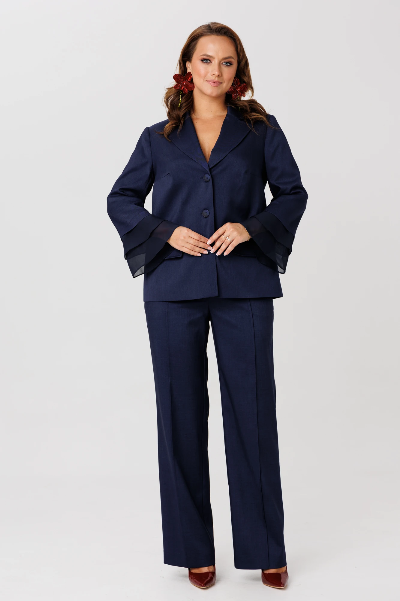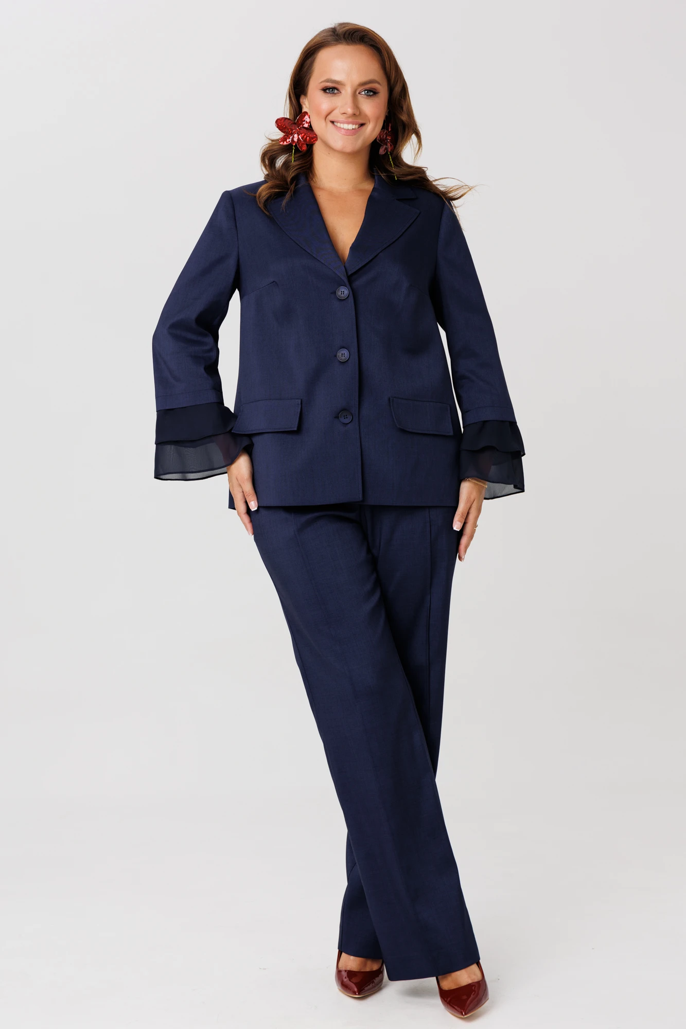 Жакет прямого силуэта с нагрудными вытачками по переду. Накладные клапаны, являются имитацией кармана. По горловине воротник с отложными бортами пиджачного типа. Застежка на три петли-пуговицы. По спинке центральный разрез эффектно оформлен декоративной вставкой из струящегося шифона, который дополняет отделочная пуговица (не функциональная при застегивании). Рукав втачной, двухшовный, длина 7/8. По низу рукава два притачных волана из шифоновой ткани. Жакет на подкладке.