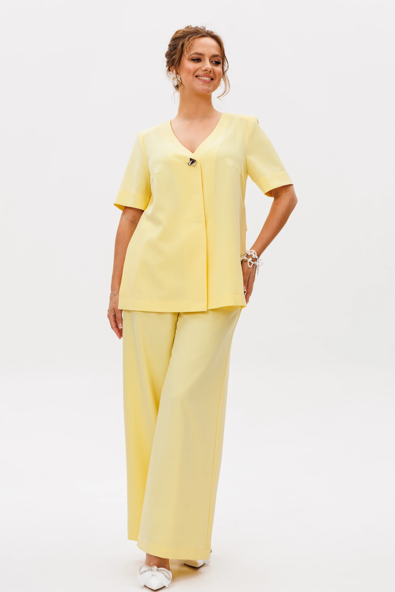 58Жакет прямого силуэта без подкладки. По переду нагрудные вытачки. По спинке средний шов. По боковым швам – шлицы. Горловина с V-образным вырезом. Застежка центральная на отделочную пуговицу и две пришивные кнопки. Рукава втачные одношовные. Жакет дополнен съемным поясом из основной ткани.
