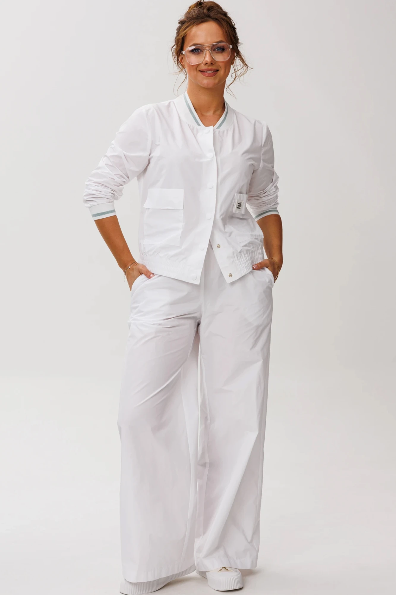 46, 48 , 50 ,52,54,56Бомбер прямого силуэта с центральной застежкой на пробивные кнопки. По переду накладные карманы с цельнокроенными клапанами. На левом клапане – пришивной лейбл. Спинка цельная. Рукава втачные одношовные на притачной манжете из довяза. Горловина округлая, оформлена довязом. Низ бомбера оформлен притачным поясом из основной ткани с эластичной резинкой.