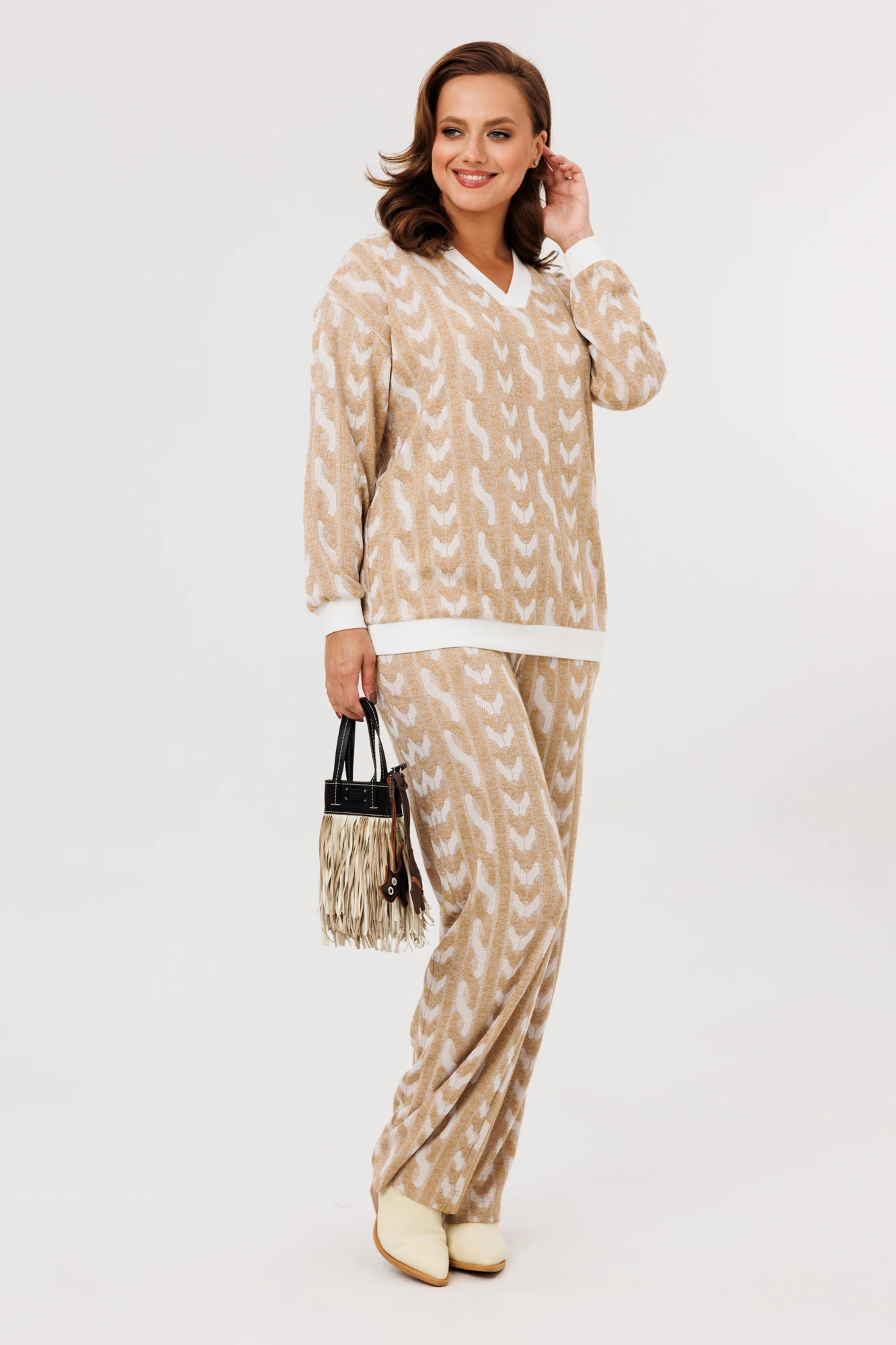 Джемпер прямого силуэта со спущенной линией плеча, выполненный из эластичного трикотажного полотна (тянется). Перед и спинка цельные. Горловина V-образной формы, оформлена довязом белого цвета, который освежает. Рукав одношовный. По низу рукава и низу джемпера – притачные манжеты из довяза.
