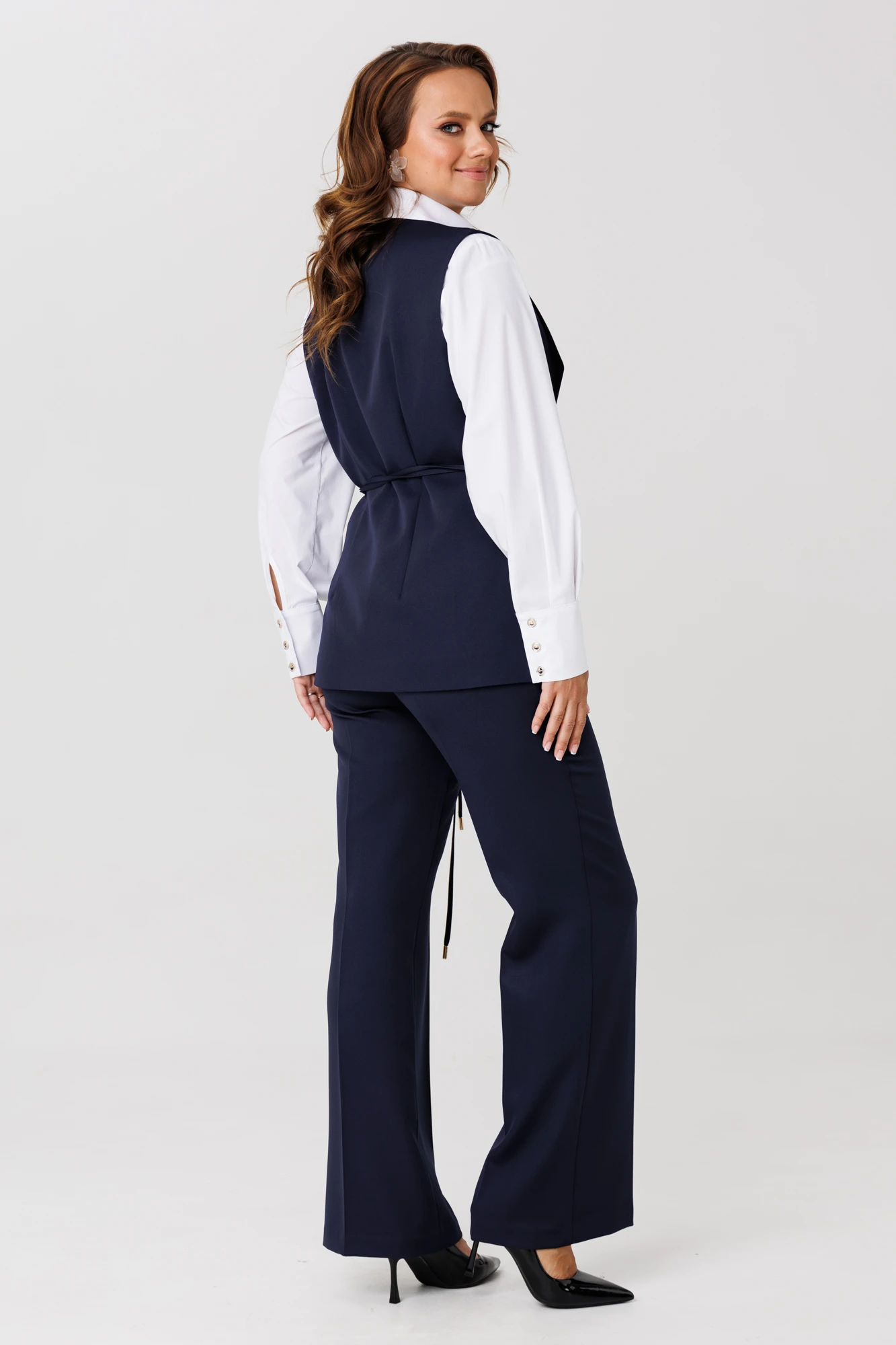 Брюки с высокой посадкой, расширенные от колена к низу, выполнены из костюмной ткани (тянется). По срезу банта-застежка-молния. Верхний срез оформлен поясом с эластичной резинкой по задней половинке. Брюки без карманов.