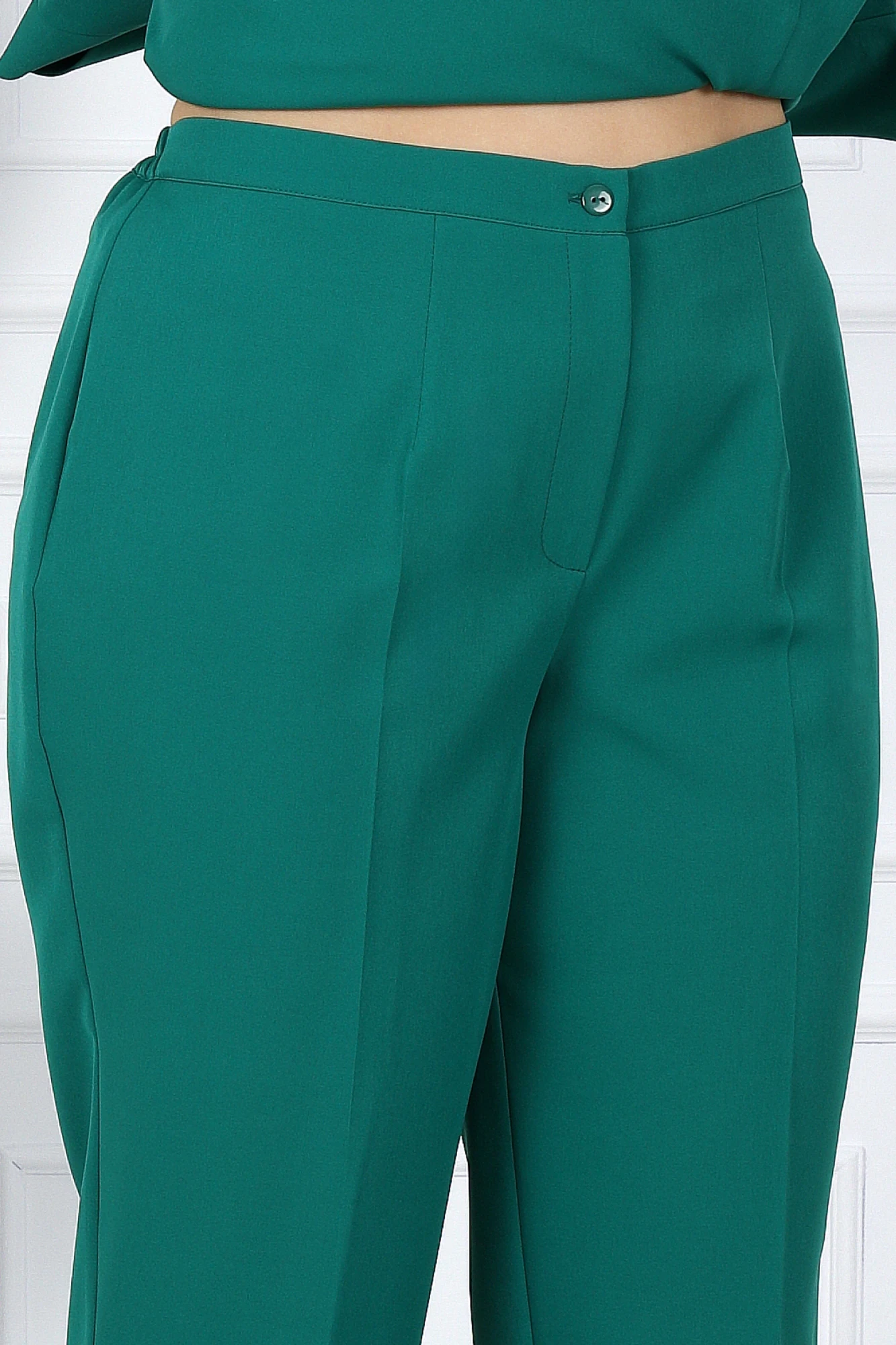 Брюки классические, с посадкой на талии, на притачном поясе, с застёжкой на тесьму-«молния», расположенную в среднем шве передних половинок, и 1 петлю и 1 пуговицу на поясе. Передние и задние половинки брюк с талиевыми вытачками, идущими от пояса вниз, с заутюженными стрелками. Для лучшего прилегания брюк в области талии в поясе со стороны спинки вставлена резинка.