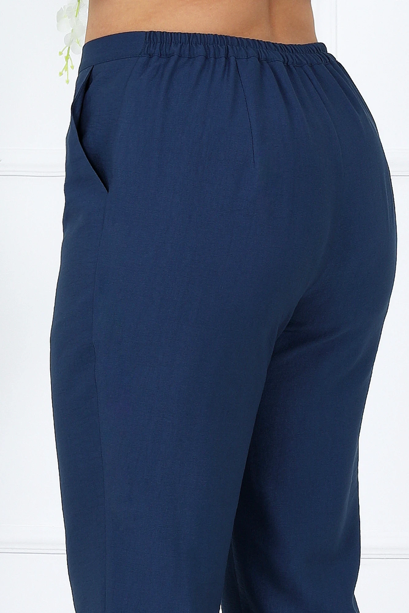 Брюки классические, прямого силуэта, с посадкой на талии, на притачном поясе, с застёжкой на тесьму-«молния», расположенную в среднем шве передних половинок, и 1 петлю и 1 пуговицу на поясе. Передние и задние половинки брюк с талиевыми вытачками, идущими от пояса вниз, с боковыми наклонными карманами на передних половинках. Для лучшего прилегания брюк в области талии в поясе со стороны спинки вставлена эластичная резинка.