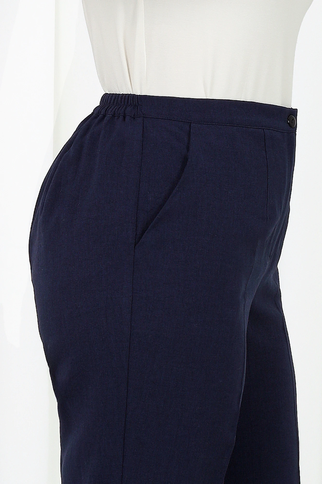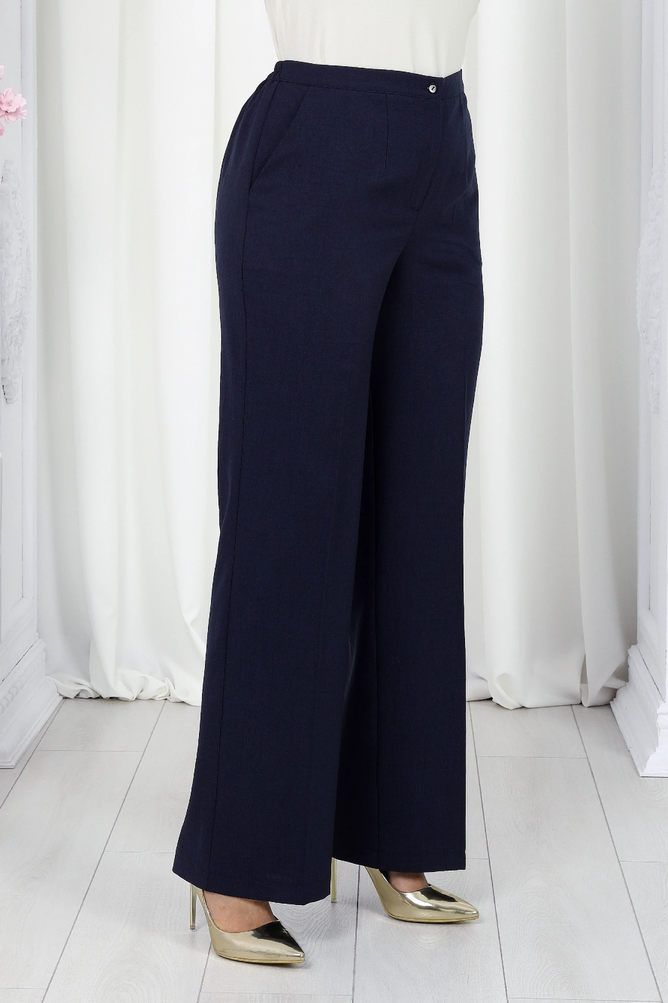 Брюки классические, длинные, с посадкой на талии, выполнены из ткани «лен-вишер». Модель со стрелками. Передние и задние половинки брюк с талиевыми вытачками, направленными от пояса вниз. Спереди обработаны наклонные боковые карманы и центральная застёжка на тесьму-«молнию». Притачной пояс застегивается на 1 петлю и 1 пуговицу; для лучшего прилегания по линии талии в притачном поясе предусмотрена эластичная лента, вставленная по спинке.