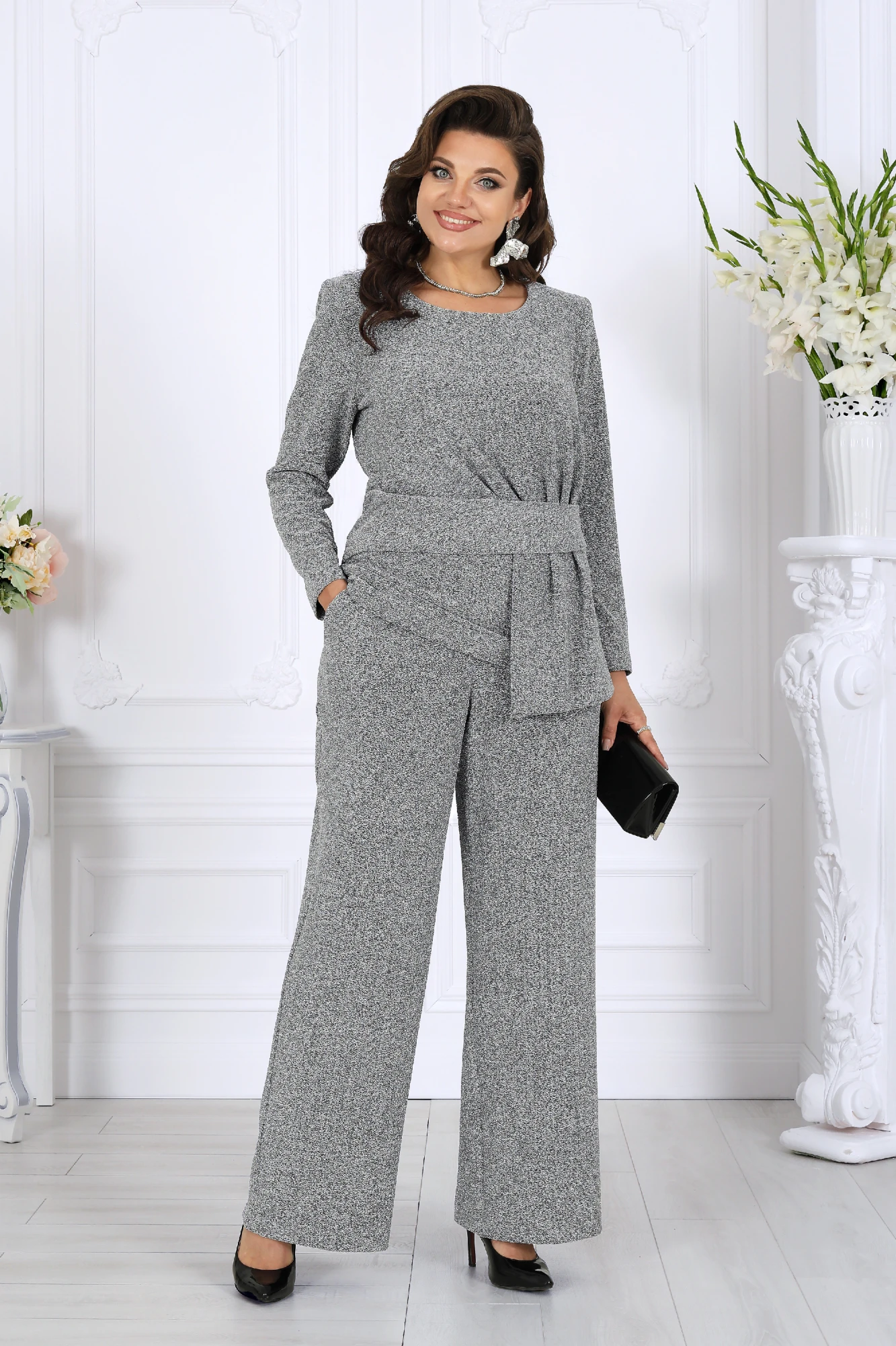 В этом костюме каждая деталь продумана так, чтобы создавать ощущение безупречного стиля и лёгкой роскоши. Мягкое мерцание люрекса делает образ выразительным и дорогим, а утончённый крой подчёркивает женственность и гармонию силуэта.