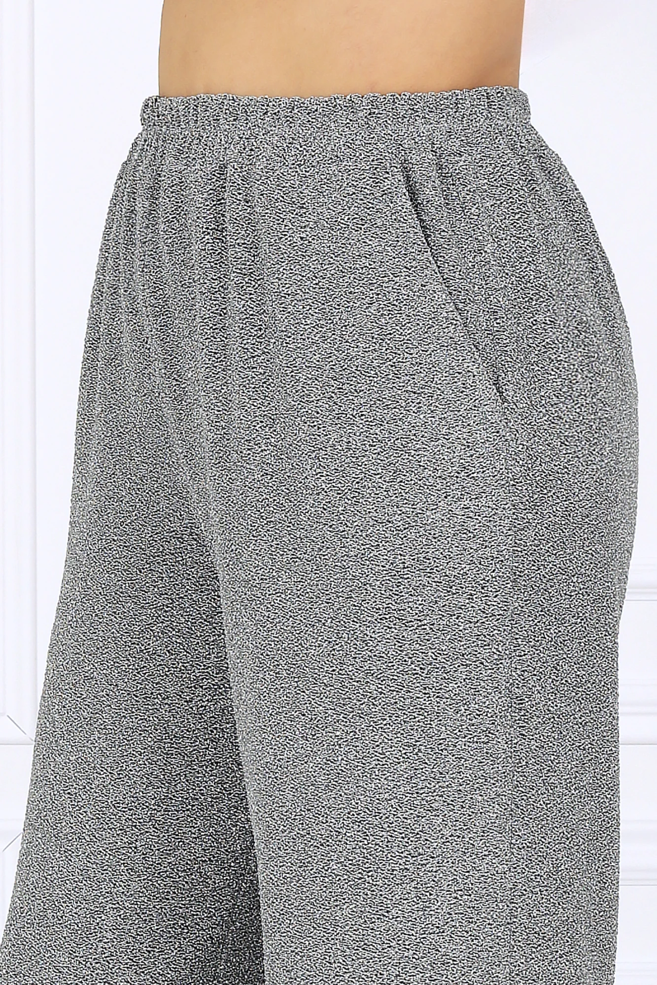 Брюки длинные, с посадкой на талии, выполнены из трикотажного полотна с фактурной лицевой стороной «люрекс». Модель без стрелок, без застежки. Спереди обработаны наклонные боковые карманы. Для лучшего прилегания по линии талии в притачном поясе предусмотрена эластичная лента, вставленная по всей длине.