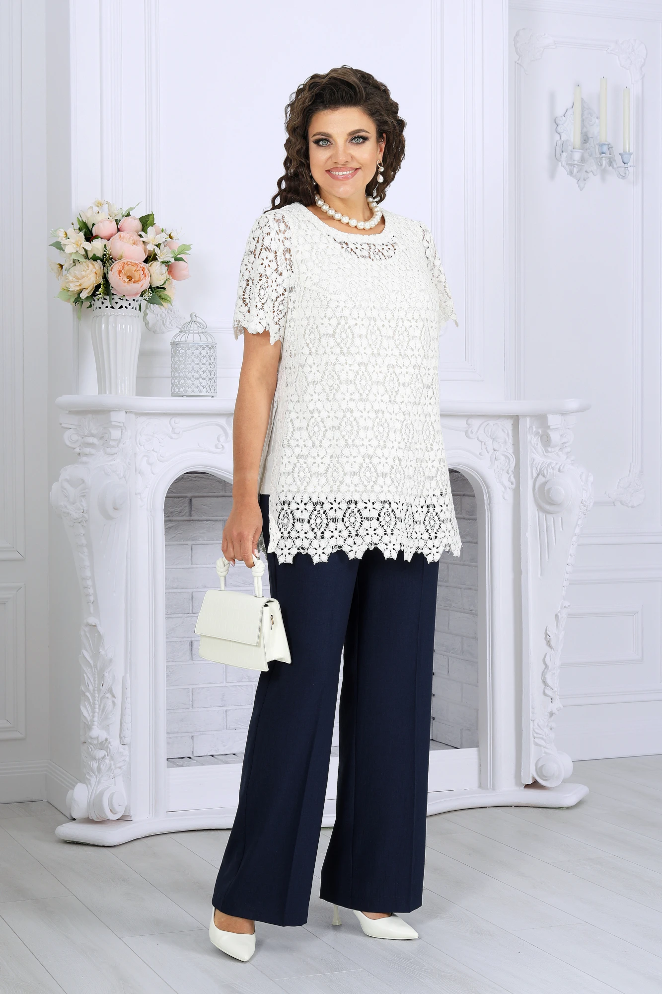 Блузка полуприлегающего силуэта, выполнена из хлопкового кружева. Модель без застежки, без плечевых накладок, с высокими (от талии) разрезами в боковых швах. С изнанки разрезы обработаны хлопковой тесьмой в цвет кружева, закрепленной с лицевой стороны отделочной строчкой шириной 3 см. Круглый вырез горловины переда и спинки обработан обтачкой из костюмно-плательной ткани в цвет кружева; ширина отделочной строчки по горловине 2 см. Рукав втачной, короткий. Низ блузки и низ рукава оформлен фестонами. Длина блузки – 76 см; длина рукава – 24 см.
