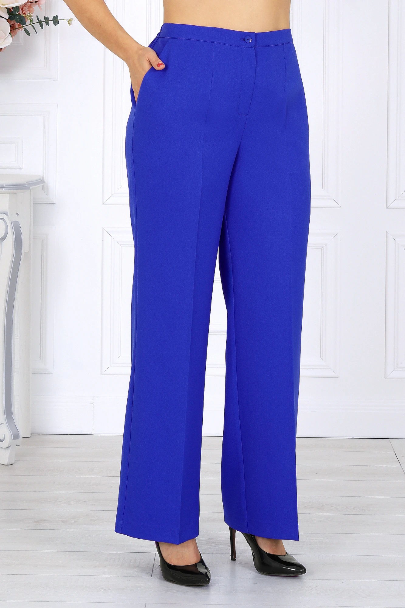 Брюки классические, с кантами и посадкой на талии, выполнены из костюмной поливискозы. Модель с центральной застёжкой на тесьму-«молнию», на притачном поясе, застегивающемся на петлю и пуговицу. Передние и задние половинки брюк с талиевыми вытачками, направленными от пояса вниз. Спереди обработаны боковые наклонные карманы. Для лучшего прилегания брюк в области талии в поясе по задним половинкам вставлена эластичная лента.