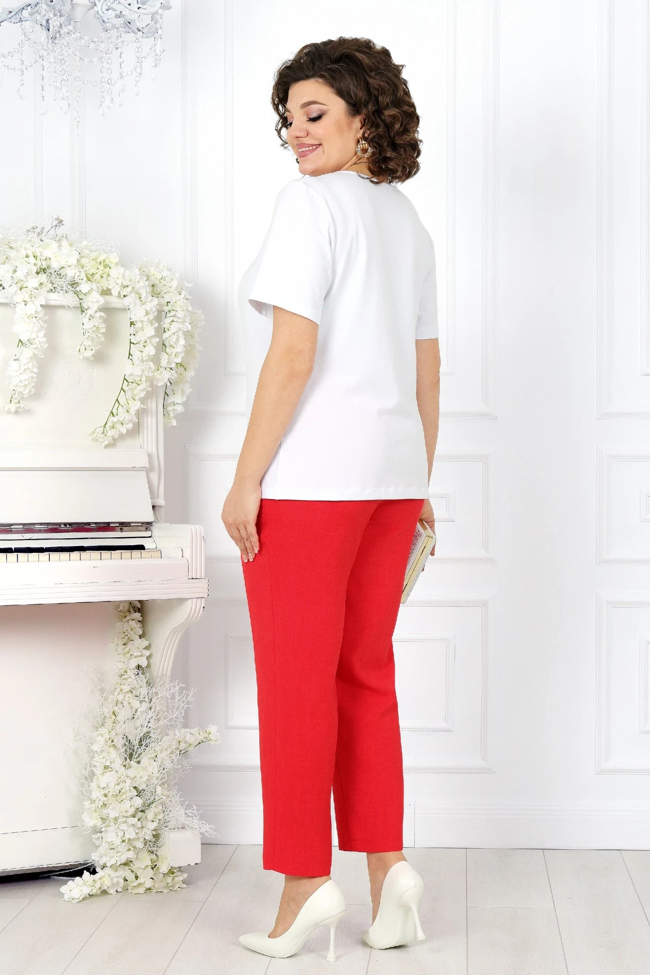 Брюки с посадкой на талии, зауженные к низу, на притачном поясе с резинкой вдоль всего пояса, длиной по боковому шву 103 см с учетом пояса. На передних половинках брюк расположены наклонные боковые карманы. Джемпер полуприлегающего силуэта, длиной по середине спинки 63 см. Перед с нагрудными вытачками, выходящими из пройм. Из горловины вниз застрочены 4 складки. Горловина переда и спинки округлой формы, по переду углубленная. Срезы горловин окантованы косой бейкой. Рукава втачные, одношовные. Длина рукава 26 см.