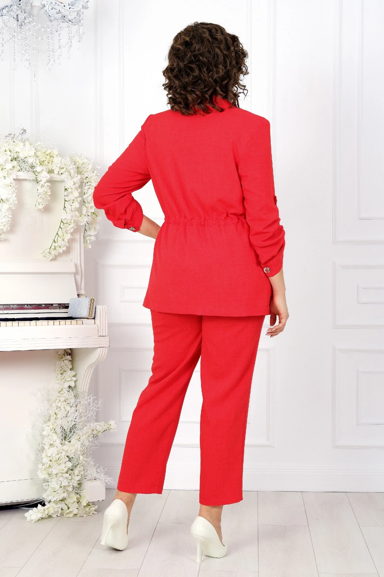 Жакет прямого силуэта, с центральной бортовой застежкой с отрезными планками на 7 петель и 7 пуговиц, со стояче-отложным воротником с отрезной стойкой. Длина изделия по середине спинки 73 см от шва втачивания воротника в горловину. Перед с нагрудными вытачками, выходящими из пройм. В нижней части переда настрочены накладные карманы, с имитацией бантовой складки посередине кармана и клапаны, застегивающиеся на 1 петлю и 1 пуговицу. По спинке и частично по переду настрочена кулиса, в которую втянут шнур. Для регулировки сборки по кулисе на шнур продеты фиксаторы, концы шнура оформлены наконечниками. Рукава втачные, одношовные, с притачными манжетами, застегивающимися на 1 петлю и 1 пуговицу, с разрезами в нижних швах рукавов, с настрочными патами, застегивающимися на 1 петлю и 1 пуговицу. Длина рукава с манжетой 62 см. Длина рукава может регулироваться с помощью паты. Жакет с плечевыми накладками.