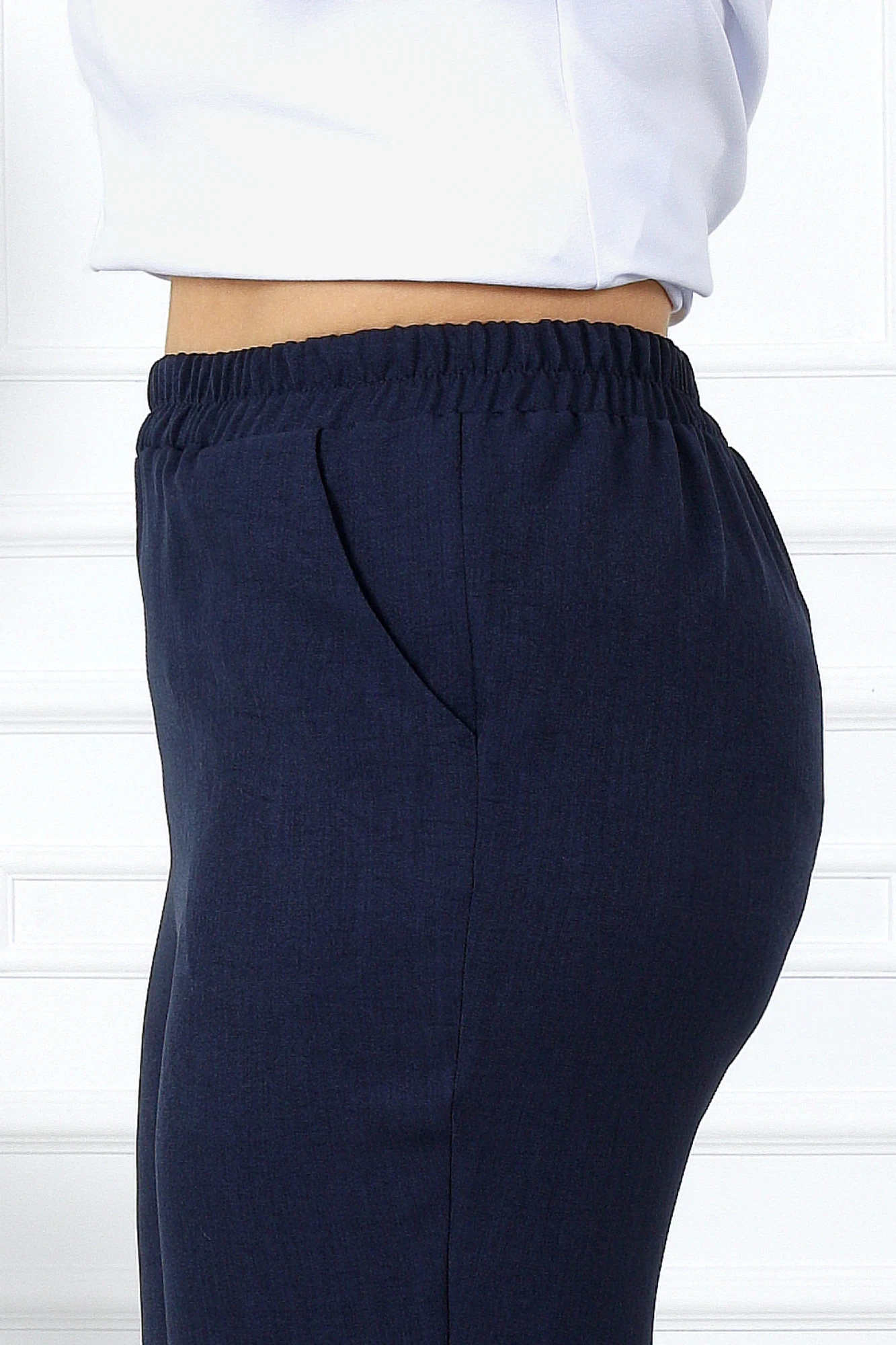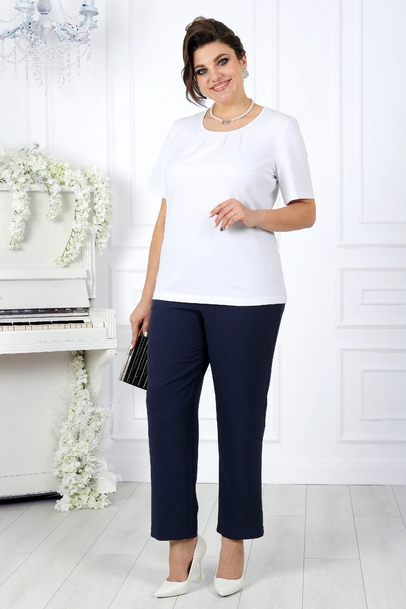 Брюки с посадкой на талии, зауженные к низу, на притачном поясе с резинкой вдоль всего пояса. На передних половинках брюк расположены наклонные боковые карманы.