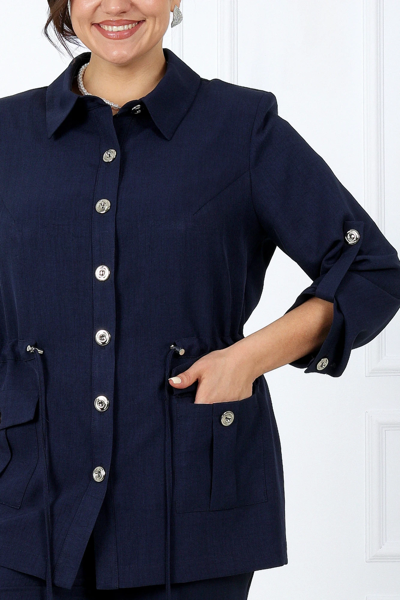 Жакет прямого силуэта, с центральной бортовой застежкой с отрезными планками на 7 петель и 7 пуговиц, со стояче-отложным воротником с отрезной стойкой. Длина изделия по середине спинки 73 см от шва втачивания воротника в горловину. Перед с нагрудными вытачками, выходящими из пройм. В нижней части переда настрочены накладные карманы, с имитацией бантовой складки посередине кармана и клапаны, застегивающиеся на 1 петлю и 1 пуговицу. По спинке и частично по переду настрочена кулиса, в которую втянут шнур. Для регулировки сборки по кулисе на шнур продеты фиксаторы, концы шнура оформлены наконечниками. Рукава втачные, одношовные, с притачными манжетами, застегивающимися на 1 петлю и 1 пуговицу, с разрезами в нижних швах рукавов, с настрочными патами, застегивающимися на 1 петлю и 1 пуговицу. Длина рукава с манжетой 62 см. Длина рукава может регулироваться с помощью паты. Жакет с плечевыми накладками.