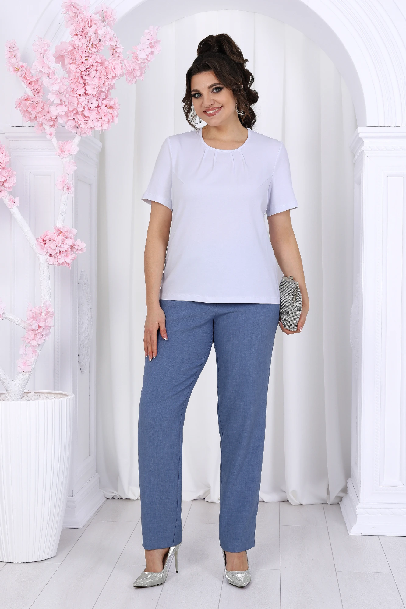 Брюки классические длинные, прямого силуэта, с посадкой на талии, выполнены из ткани «лен-вишер». Модель без застёжки, на притачном поясе, с эластичной лентой внутри. Передние половинки брюк с боковыми наклонными карманами.