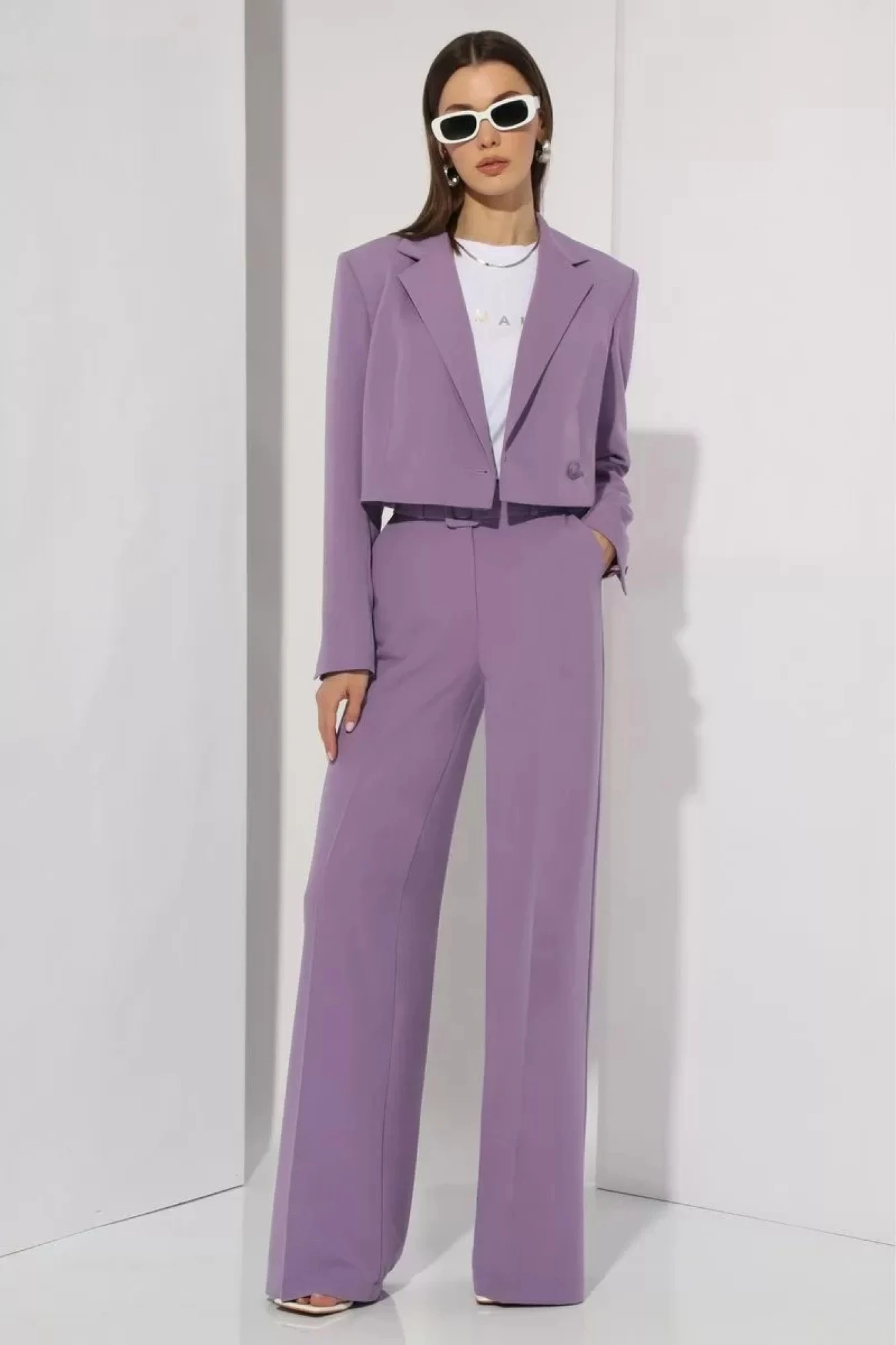 Брюки прямые, к низу расширенны. Верхний срез брюк обработан поясом со шлевками. В боковых швах расположены наклонные карманы. На задних половинках расположены талевые вытачки. В комплект входит пояс из основной ткани.