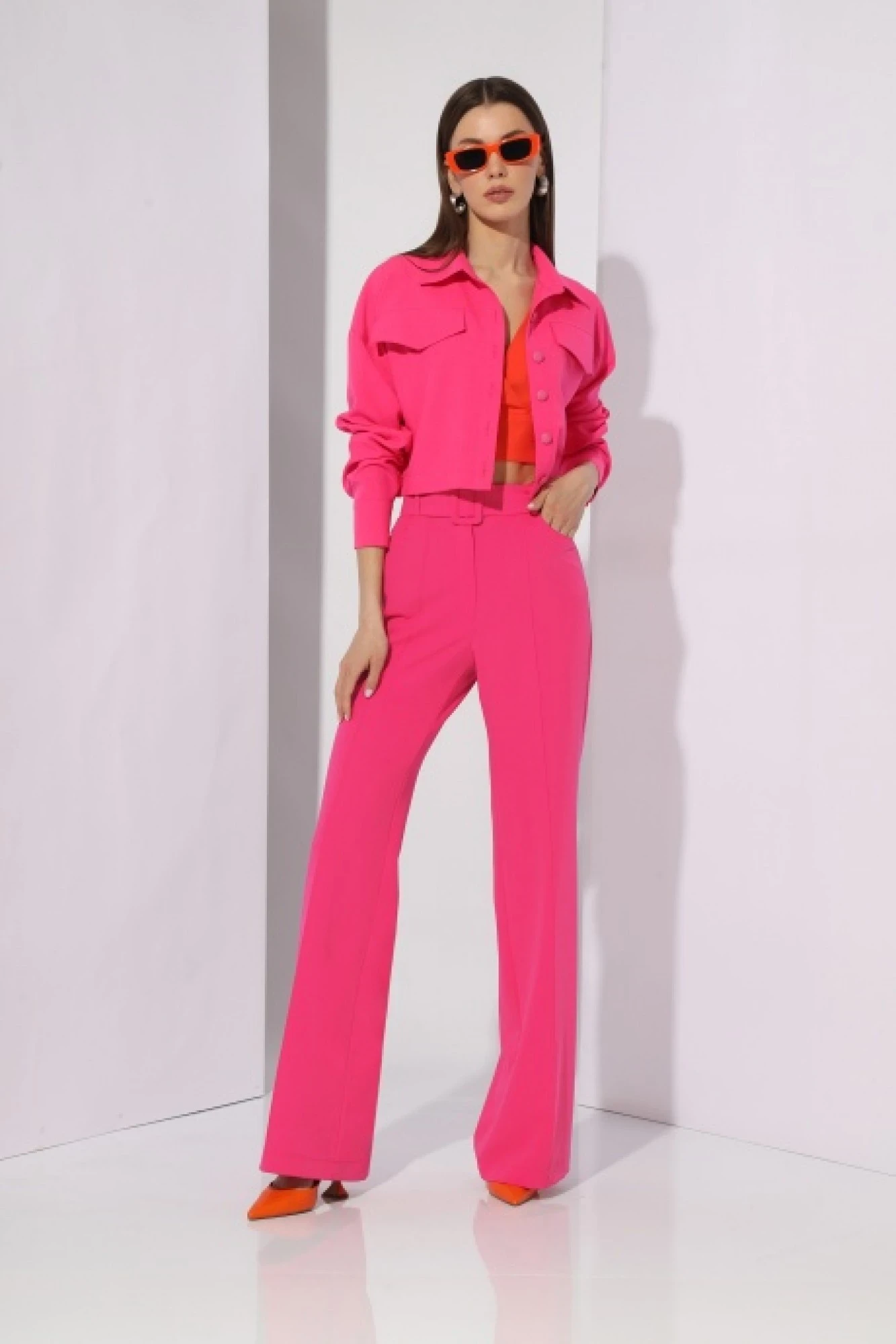 42,44,46,48, 50 , 52Брюки слегка расширены к низу от уровня колена. Верхний срез брюк обработан поясом. В боковых швах расположены карманы округлой формы. На передних и задних половинках отстрочены стрелки. На поясе расположены шлевки. На задних половинках расположена кокетка. К жакету прилагается пояс из основной ткани.