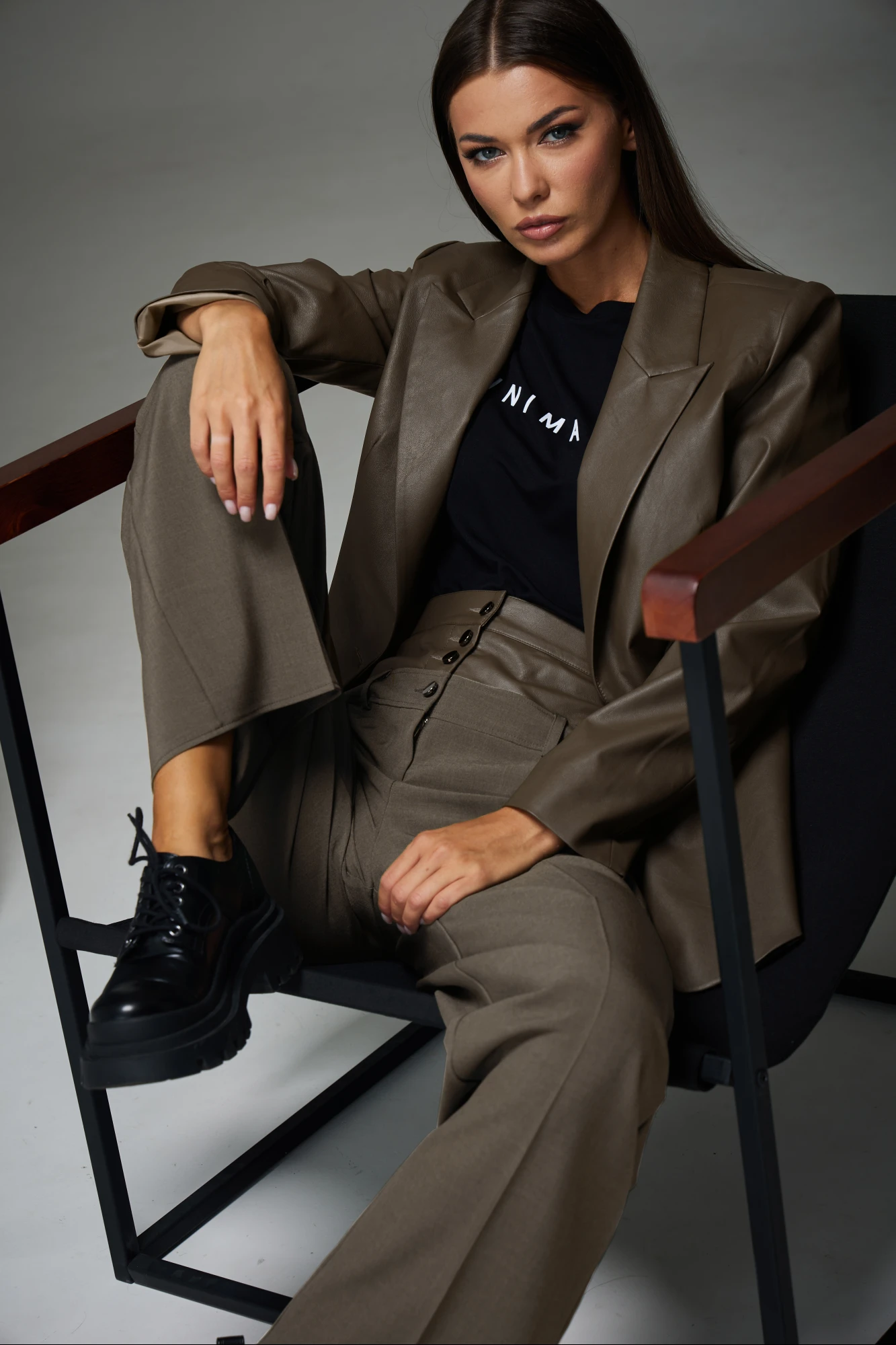 Брюки комбинированные из двух видов тканей, прямой формы, в области талии и бедер облегающие. В брюках заутюжены стрелки. Кокетка передней и задней половинки выполнены в тон основной ткани, пояс выполнен из экокожи. На передних половинках выполнены застежка на петли и пуговицы на гульфик. Нижний пояс в брюках выполнен из основной ткани, на поясе расположены шлевки. В боковых швах расположены карманы закругленной формы.