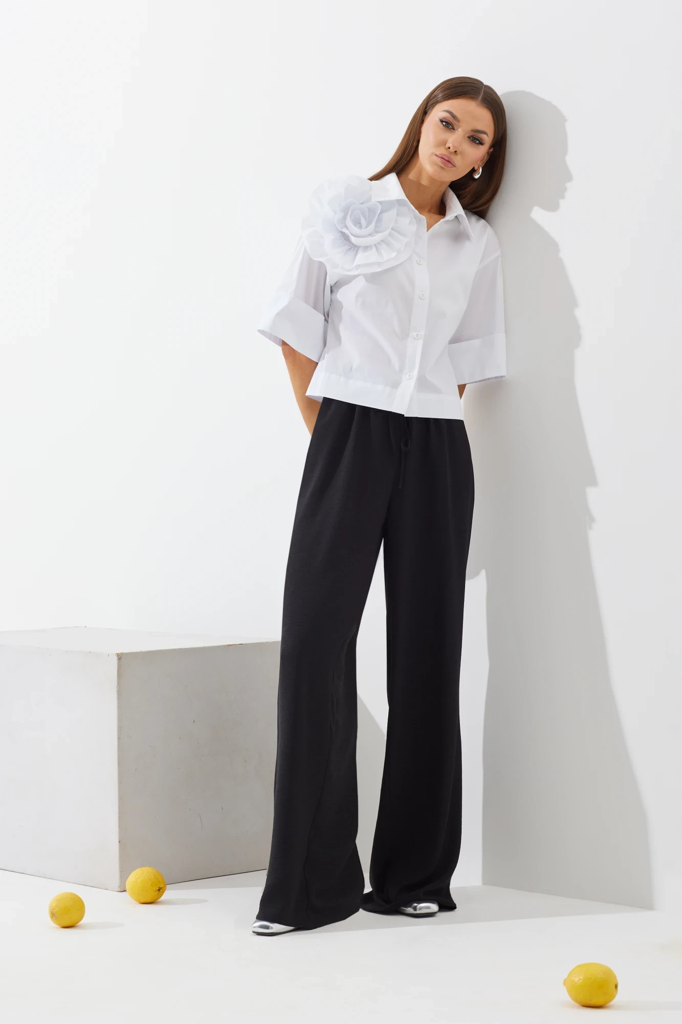 Блуза женская прямого силуэта, свободной формы, покроя спущенное плечо, с центрально-бортовой застежкой на петли-пуговицы. Горловина оформлена воротником стояче-отложным с отрезной стойкой. Рукав одношовный, широкий, короткий с центральной манжетой. Спинка и перед цельные. На правой части переда расположена аппликация в виде цветка из основной ткани.
