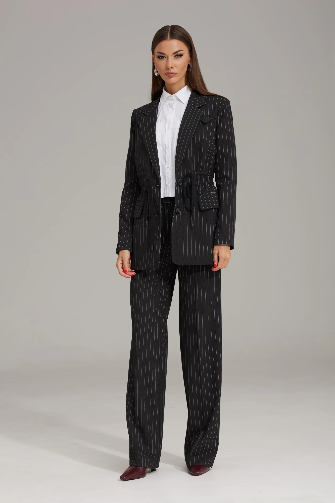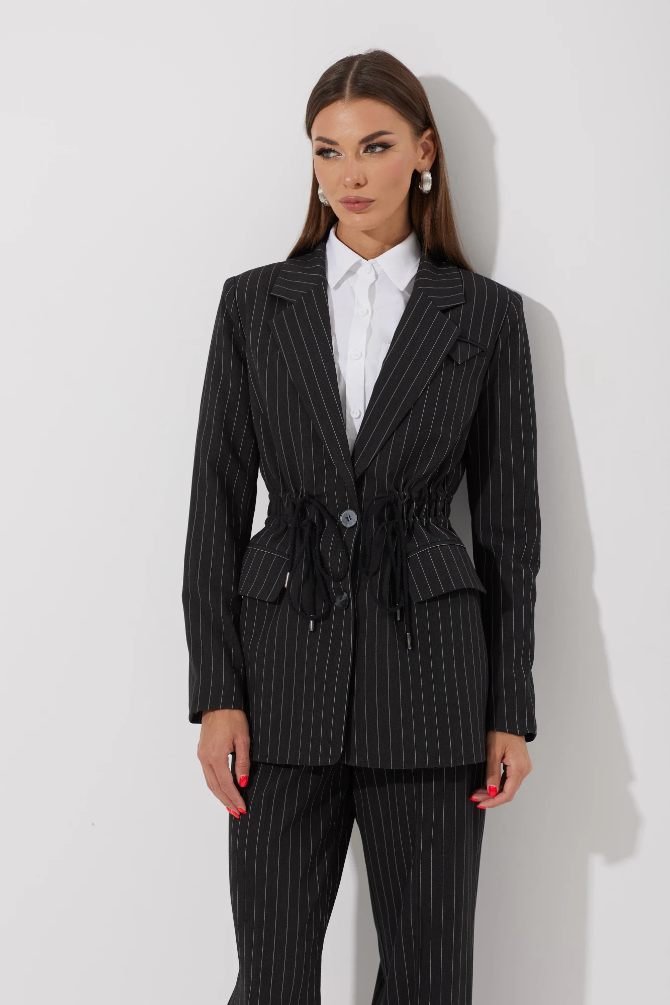 42,44,46, 48 , 50Жакет на подкладке, полуприлегающего силуэта, втачного покроя с центрально-бортовой застежкой на петли и пуговицы. Горловина оформлена воротником пиджачного типа. Рукав двухшовный, полной длины. На переде расположены вертикально направленные рельефы с нагрудной вытачкой, в области бедер – прорезные карманы в рамку с клапаном. В верхней левой части переда расположен карман в рамку с клапаном, сложенным на уголок (имитация). Клапаны и борта по низу имеют закругленную форму. По талии всего жакета расположена двойная кулиса с декоративным шнуром. Спинка состоит из бочка и центральной части.