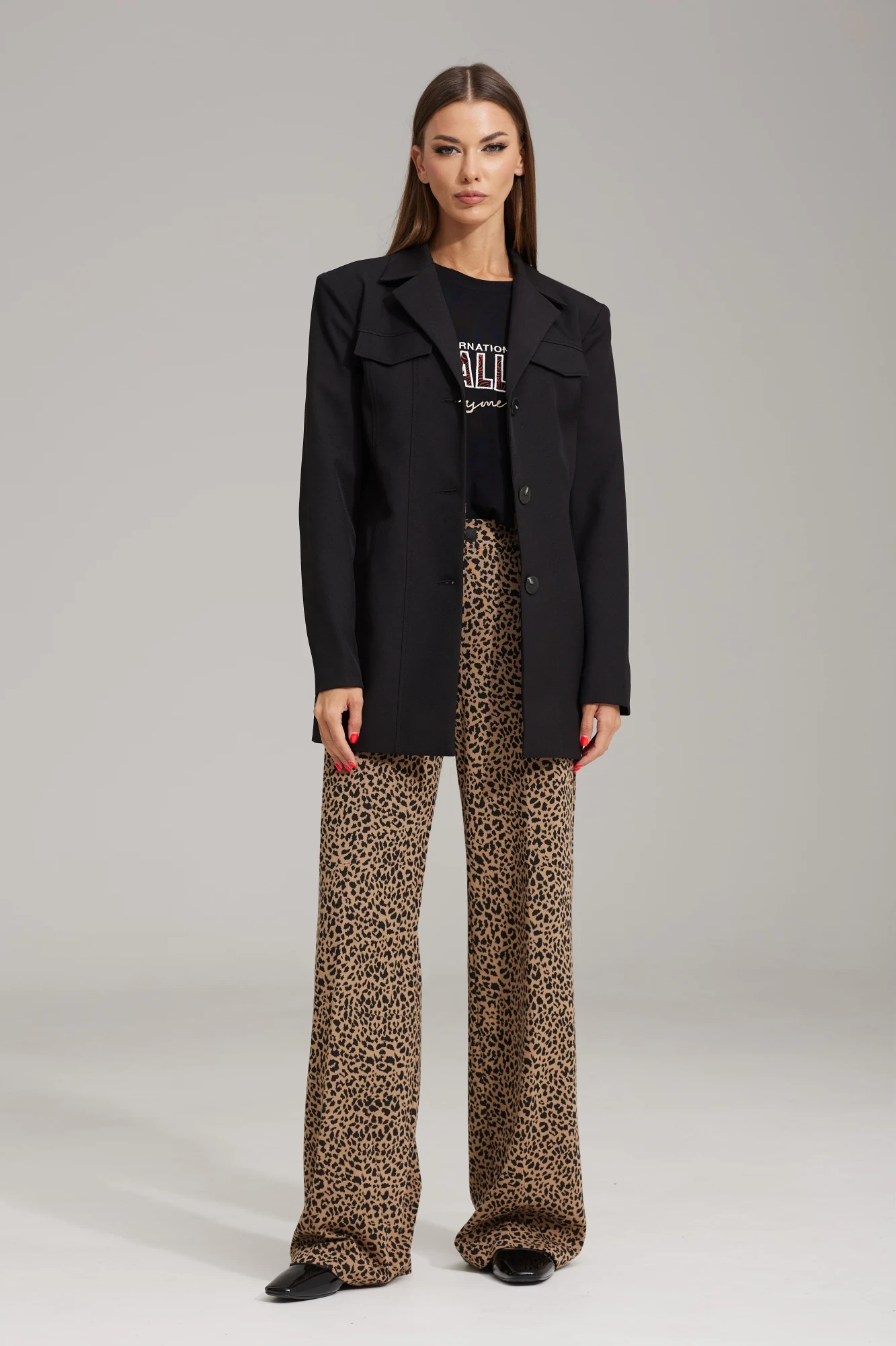 Жакет полуприлегающего силуэта, на подкладке, выполнен из однотонной ткани костюмной группы. Жакет втачного покроя с центрально-бортовой застежкой на петли и пуговицы. Горловина оформлена воротником пиджачного типа. Рукав двухшовный полной длины. По переду расположена кокетка, в шов которой вставлены клапаны, далее идут втачные рельефы. В шве притачивания боковой части переда расположены карманы. Спинка состоит из кокетки, центральной части и боковых частей.