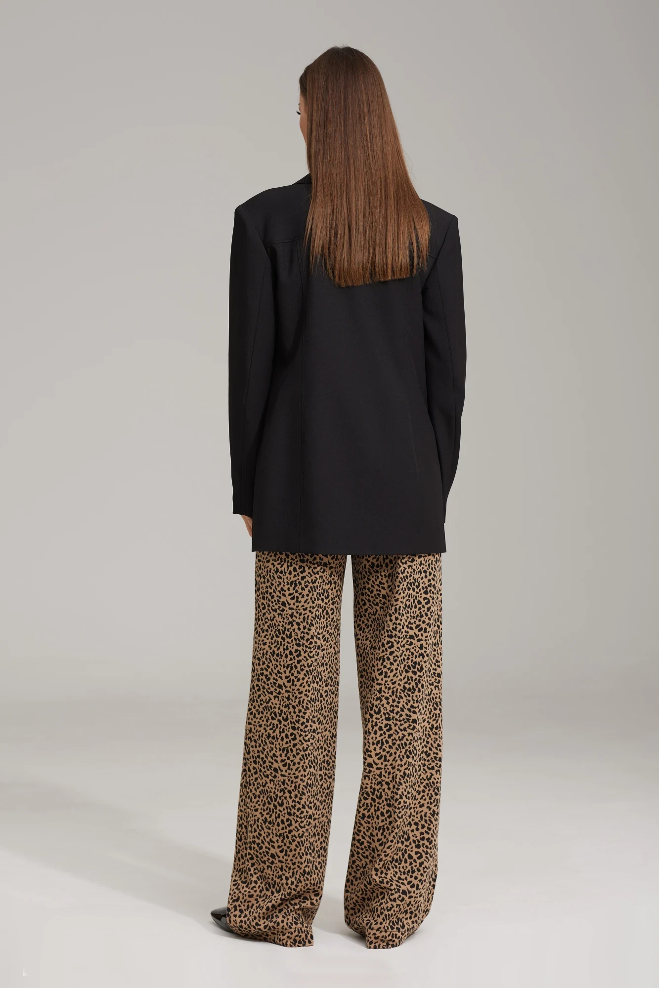Брюки прямого силуэта, выполнены из трикотажного полотна. На передних и задних половинках заутюжены стрелки. Верхний срез обработан поясом с резинкой по спинке и переду до центральной части пояса. На задней левой половинке расположена имитация кармана в рамку. На передних половинках расположены наклонные карманы, имитация застежки на гульфик.