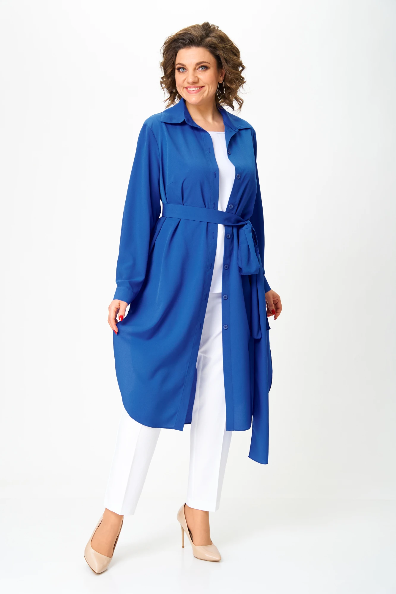 Блуза прямого силуэта, втачного покроя с центрально-бортовой застежкой на планку, цельнокроеную на петли и пуговицы. Блуза удлиненная, с закругленными высокими разрезами. Рукав длинный с манжетой на одну петлю и пуговицу. Горловина оформлена воротником стояче отложным с притачной стойкой. По переду расположены нагрудные вытачки, идущие из бокового шва. На спинке расположена кокетка горизонтальная. На нижней части спинки расположена встречная складка. К блузе прилагается декоративный пояс фантазийной формы, с помощью которого можно приталить блузу.