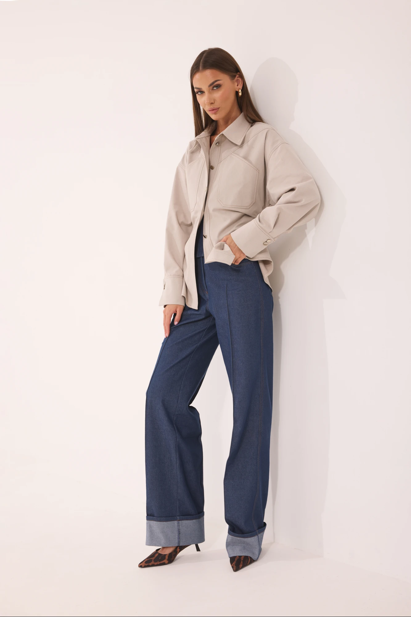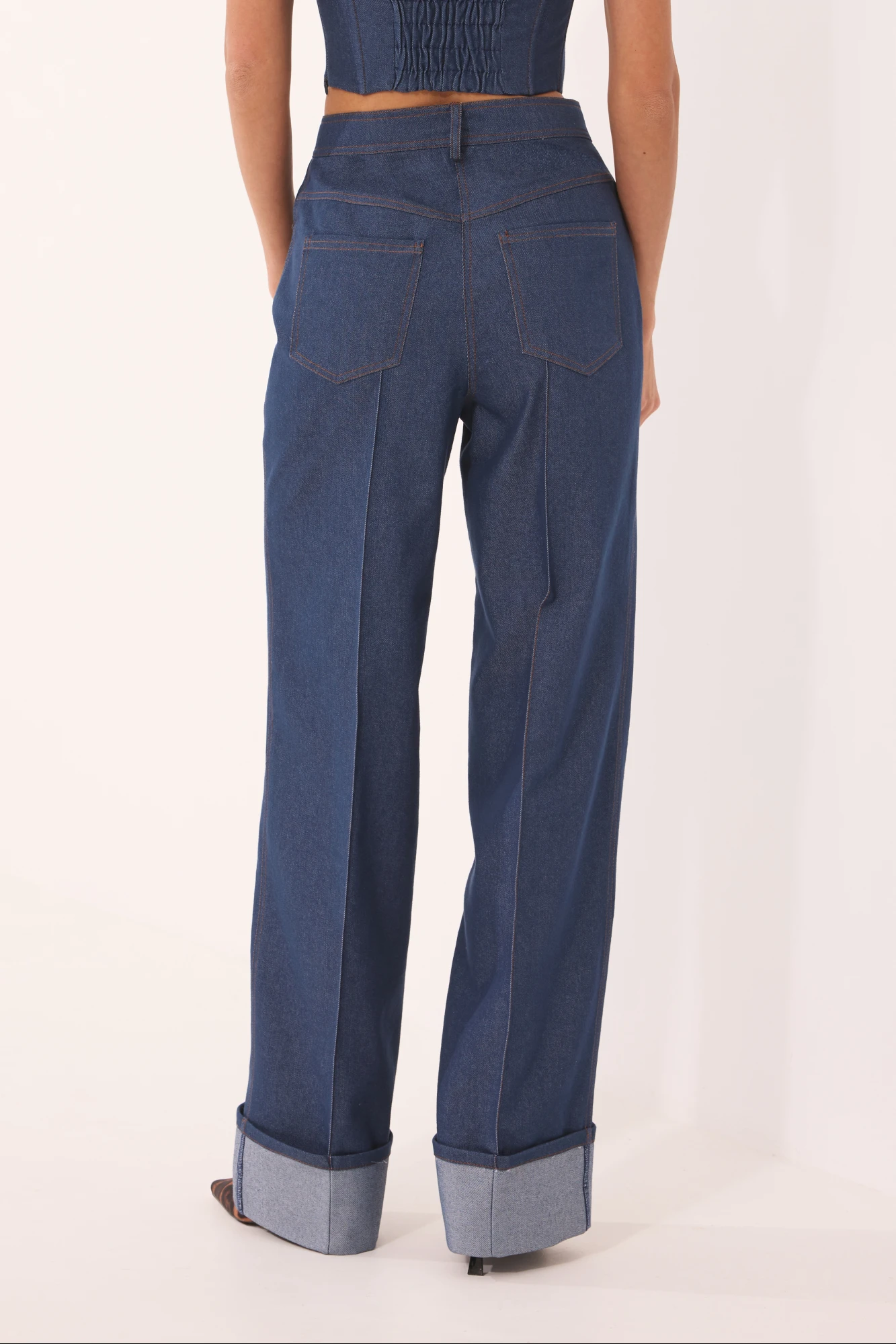 Брюки расширены к низу. На передней и задней половинках отстрочены стрелки до контрольных точек. На задней половинке – кокетка и накладные карманы. На передней половинке – боковой карман, с правой стороны – маленький накладной кармашек. Верхний срез обработан поясом со шлевками. Низ брюк с широкой манжетой на изнаночную сторону джинса.