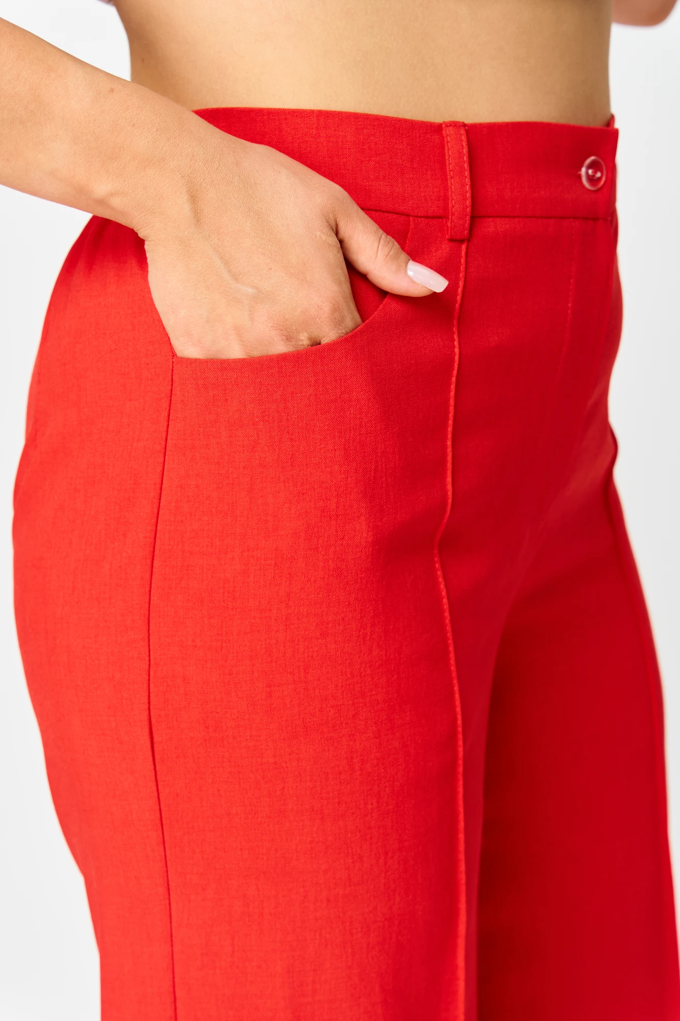Брюки прямые, с заутюженными стрелками, с боковыми полукруглыми карманами. Верхний срез обработан поясом с резинкой по задней половинке брюк. На задних половинках расположены талиевые вытачки, на передних половинках – застежка на молнию. В пояс вставлены пять шлевок.