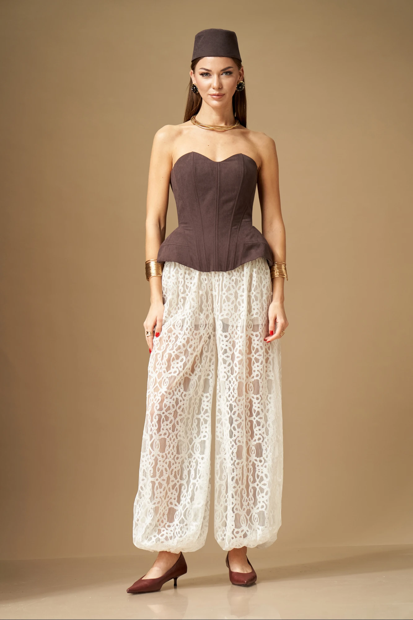 Брюки свободной формы, с низкой посадкой, сильно расширенные и собранные снизу на резинку, выполнены из кружевного полотна. Верхний срез обработан поясом на резинке, центр переда без резинки, пояс со шлевками. В пояс притачены короткие шорты из трикотажного полотна. Брюки по силуэтной форме – Алладины.