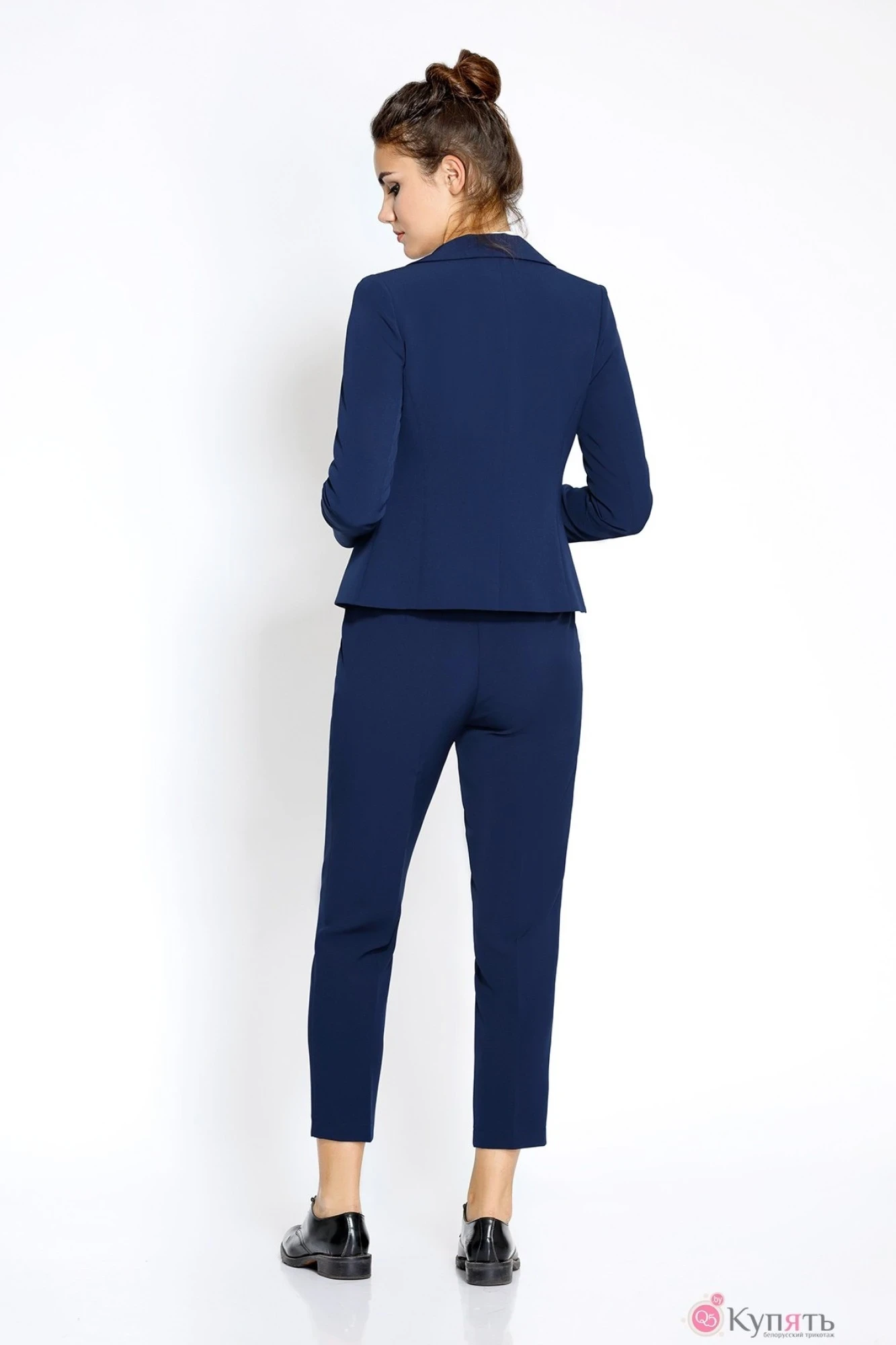 Комплект из прилегающего жакета и укороченных брюк. Детали: воротник жакета с отворотами лацканов, застежка на одну пуговицу, рукава втачные, два прорезных кармана, брюки на притачном поясе с застежкой на две пуговицы и молнию, спереди две складки, карманы, «хулиганы».