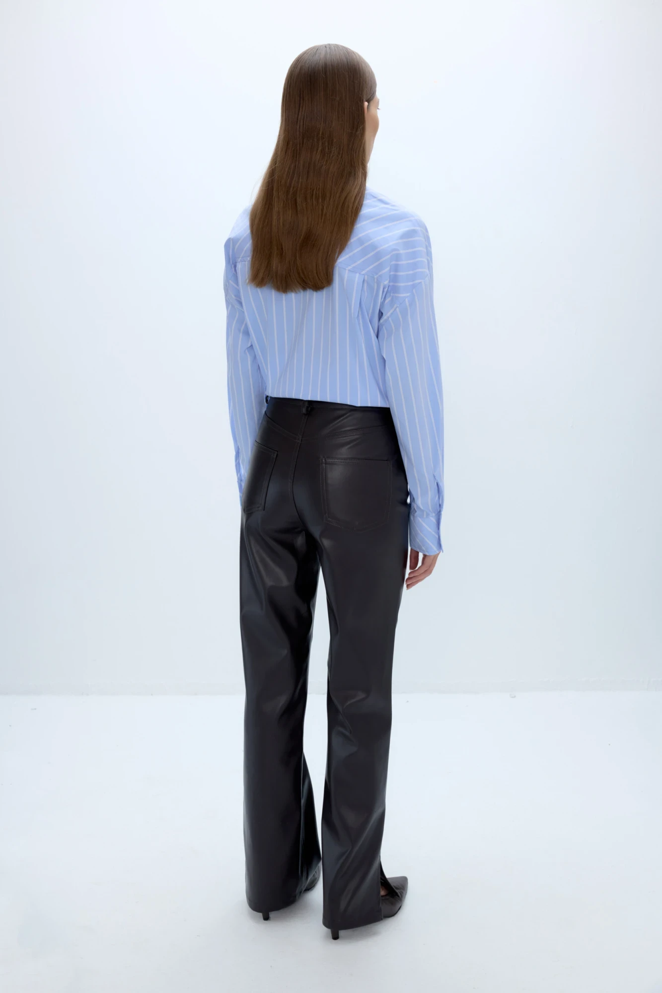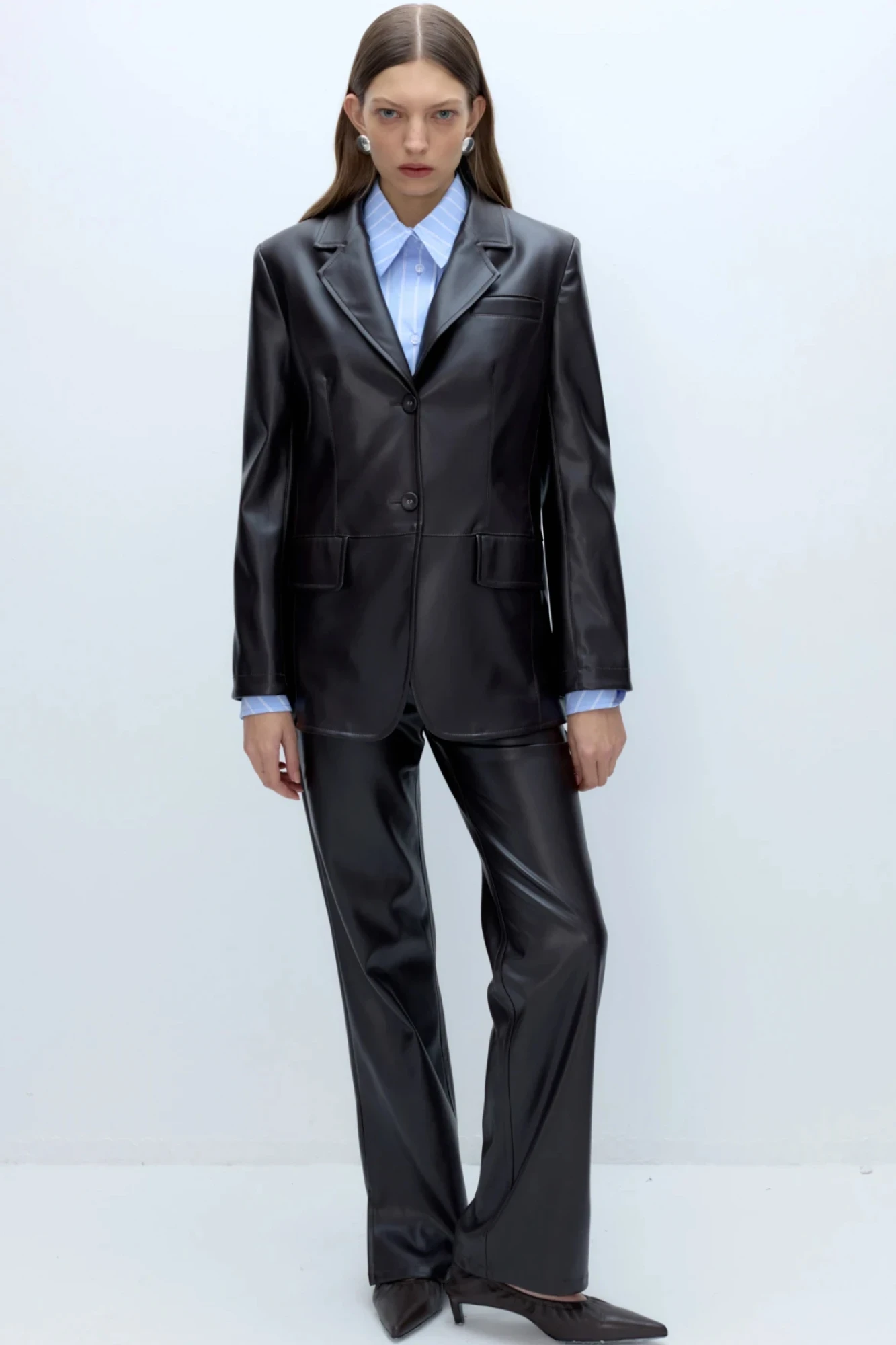 Детали: прямой силуэт, пиджачный воротник, функциональные карманы, застежка на петли и пуговицы, рукава втачные двухшовные, жакет на подкладке. Брюки с высокой посадкой, прилегающий силуэт, притачной пояс со шлевками, застежка на молнию и пуговицу, перед с боковыми карманами, спинка с кокеткой и двумя накладными карманами, разрезы по низу боковых швов. Изнанка экокожи с небольшим ворсом.