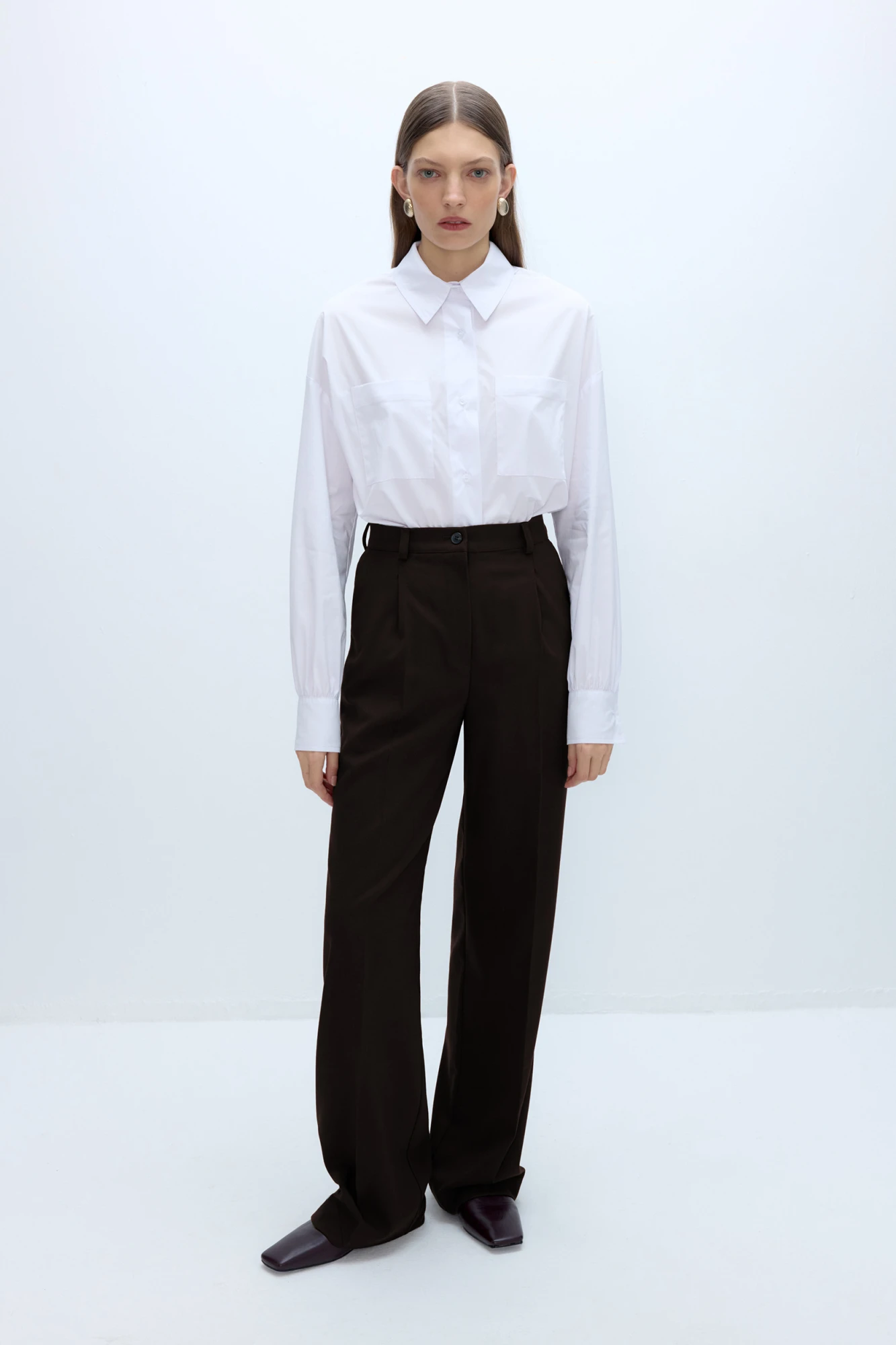 Детали: жакет с отрезными бочками и нагрудными вытачками, пиджачный воротник, прорезные карманы, двубортная застежка на петли и пуговицы, спинка со средним швом, втачные двухшовные рукава, жакет на подкладке. Брюки с высокой посадкой на притачном поясе со шлевками, застежка на молнию и пуговицу, боковые карманы, передние половины с заутюженными стрелками и двумя небольшими складками.