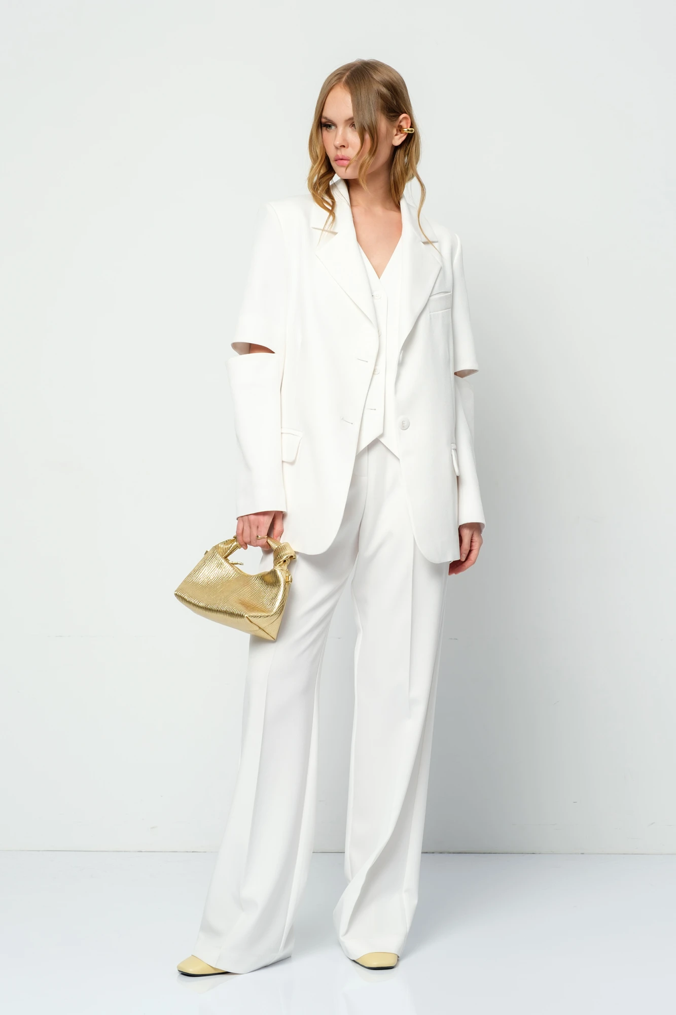 Детали: жакет свободного покроя, прямой силуэт, застежка на петли и пуговицы, функциональные карманы, жакет на подкладке. Жилет полуприлегающего силуэта, талиевые вытачками, застежка на петли и пуговицы, функциональные карманы, фигурный низ, на подкладке. Брюки с высокой посадкой на притачном поясе со шлевками, застежка на молнию и пуговицу, боковые карманы, передние половины с заутюженными стрелками и небольшими складками. Пояс брюк прямой, без резинки.