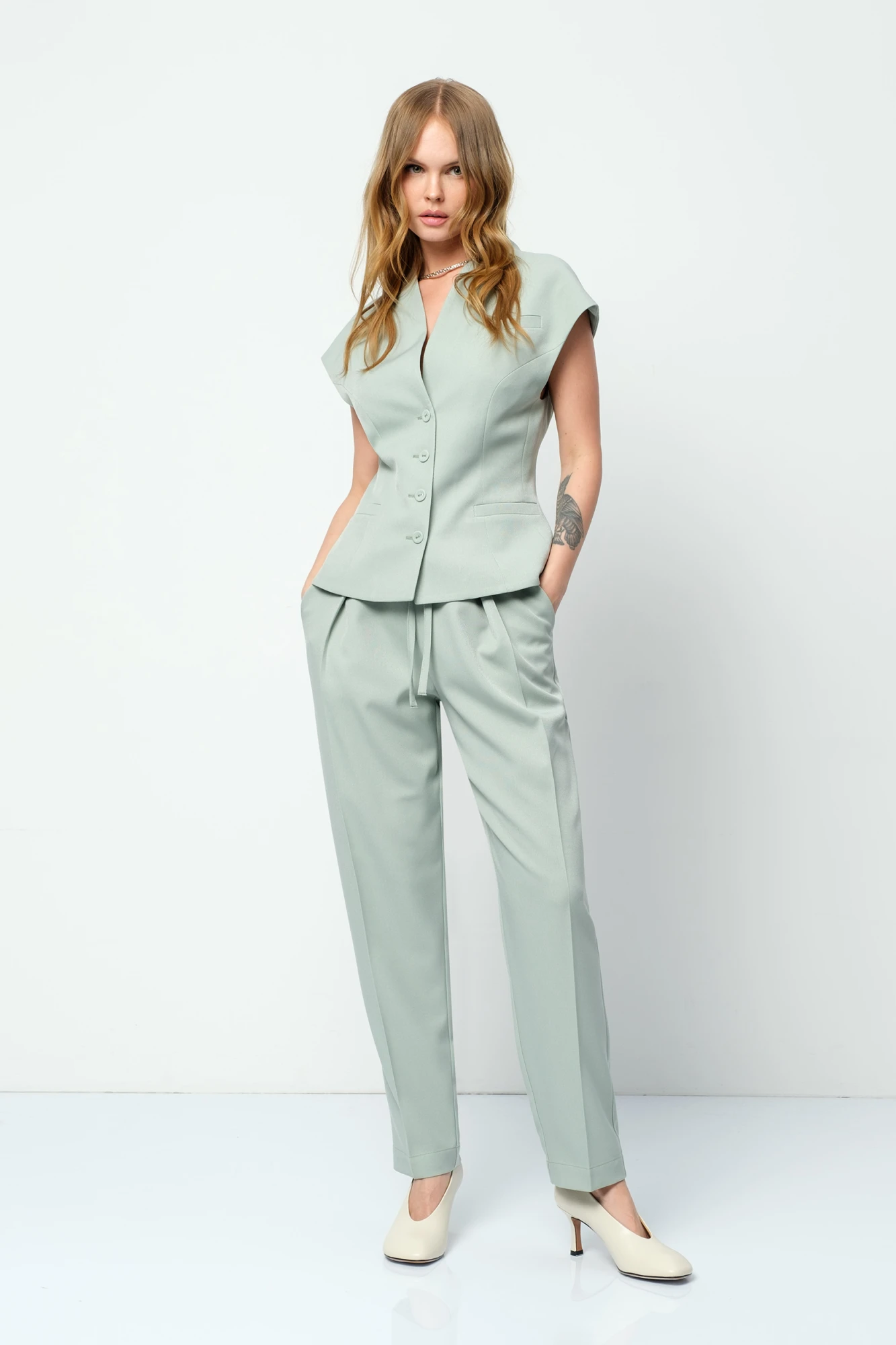 Детали: полуприлегающий силуэт, цельнокроеный воротник-стойка, рельефные швы переда и спинки, функциональные карманы, застежка на петли и пуговицы, жилет на подкладке. Брюки с высокой посадкой, притачной пояс с резинкой и шнурами, без застежки, боковые карманы, передние части брюк со складками у пояса.