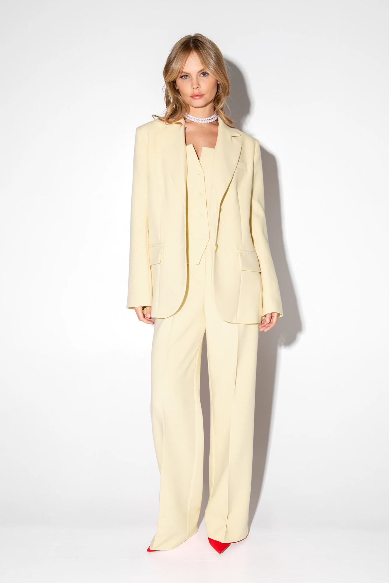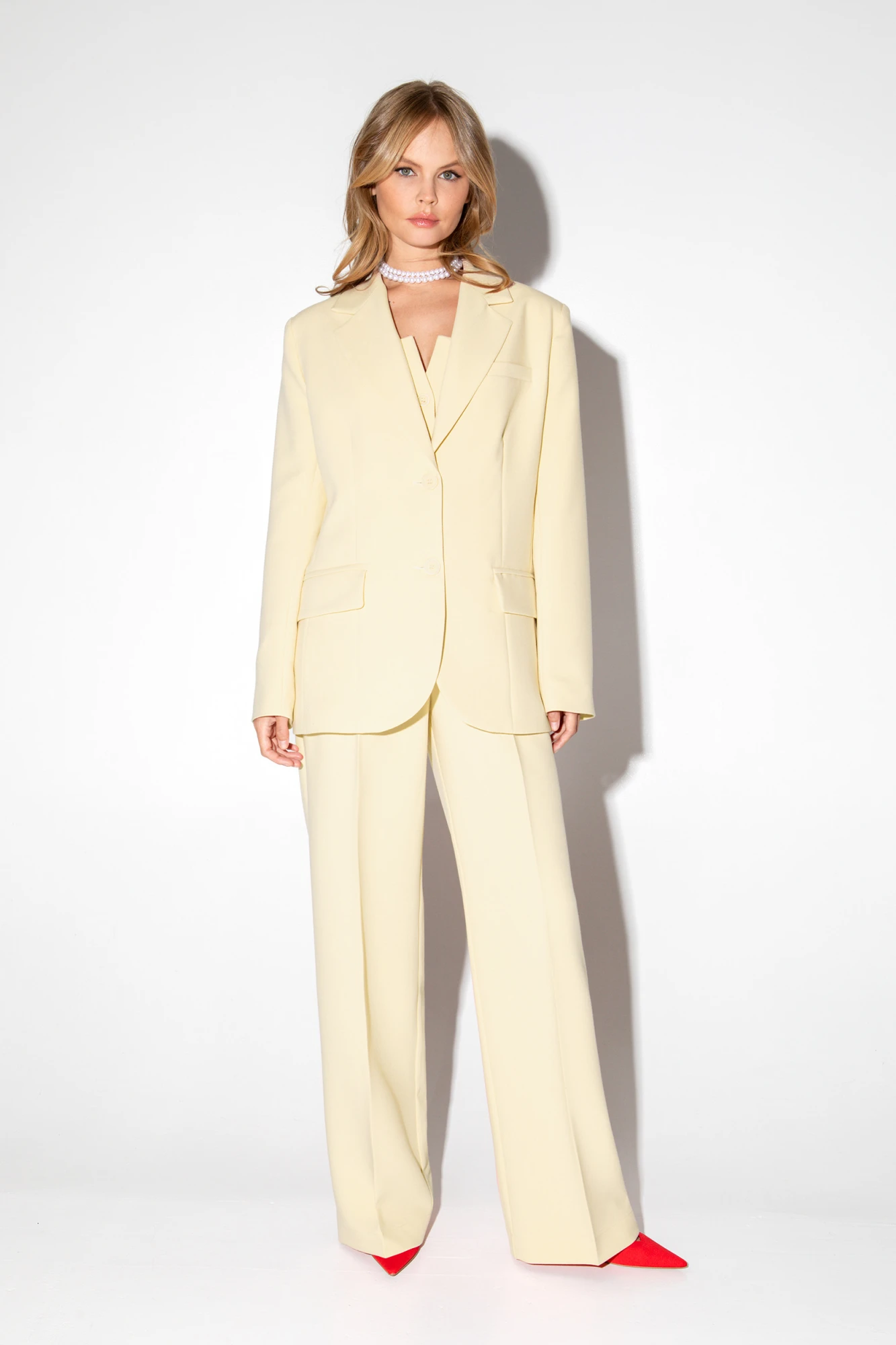 Детали: жакет прямого силуэта, расширенная линия плеч, пиджачный воротник, перед с прорезными функциональными карманами, однобортная застежка на петли и пуговицы, спинка со средним швом и шлицей, рукава втачные двухшовные, жакет на подкладке. Топ-корсет прилегающего силуэта, рельефные швы с регилином, функциональные карманы, застежка по переду на петли и пуговицы, спинка с эластичной вставкой, фигурный низ. Брюки с высокой посадкой на притачном поясе со шлевками, застежка на молнию и пуговицу, боковые карманы, передние половины с заутюженными стрелками и двумя небольшими складками. Пояс брюк прямой, без резинки.