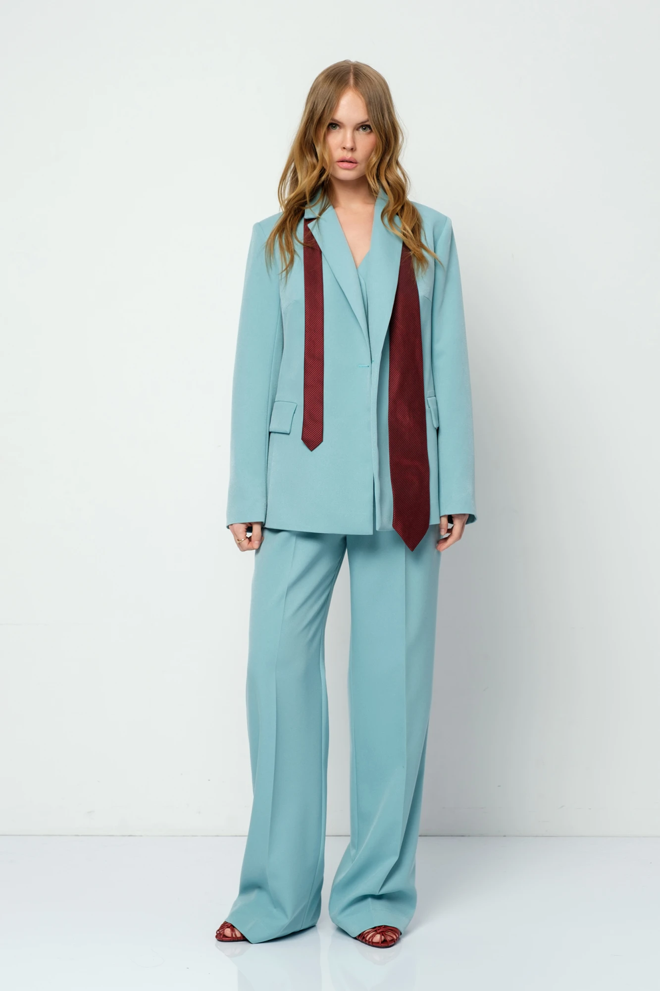 Детали: жакет полуприлегающего силуэта, отрезные бочки и нагрудные вытачки, пиджачный воротник, двубортная застежка на петли и пуговицы, прорезные карманы, спинка со средним швом, втачные двухшовные рукава, жакет на подкладке. Брюки с высокой посадкой, притачной пояс со шлевками, передние половины с небольшими застроченными мягкими складками и заутюженными стрелками, застежка на молнию и пуговицу, боковые карманы. Задние части брюк с вытачками и заутюженными стрелками. Пояс брюк прямой, без резинки.