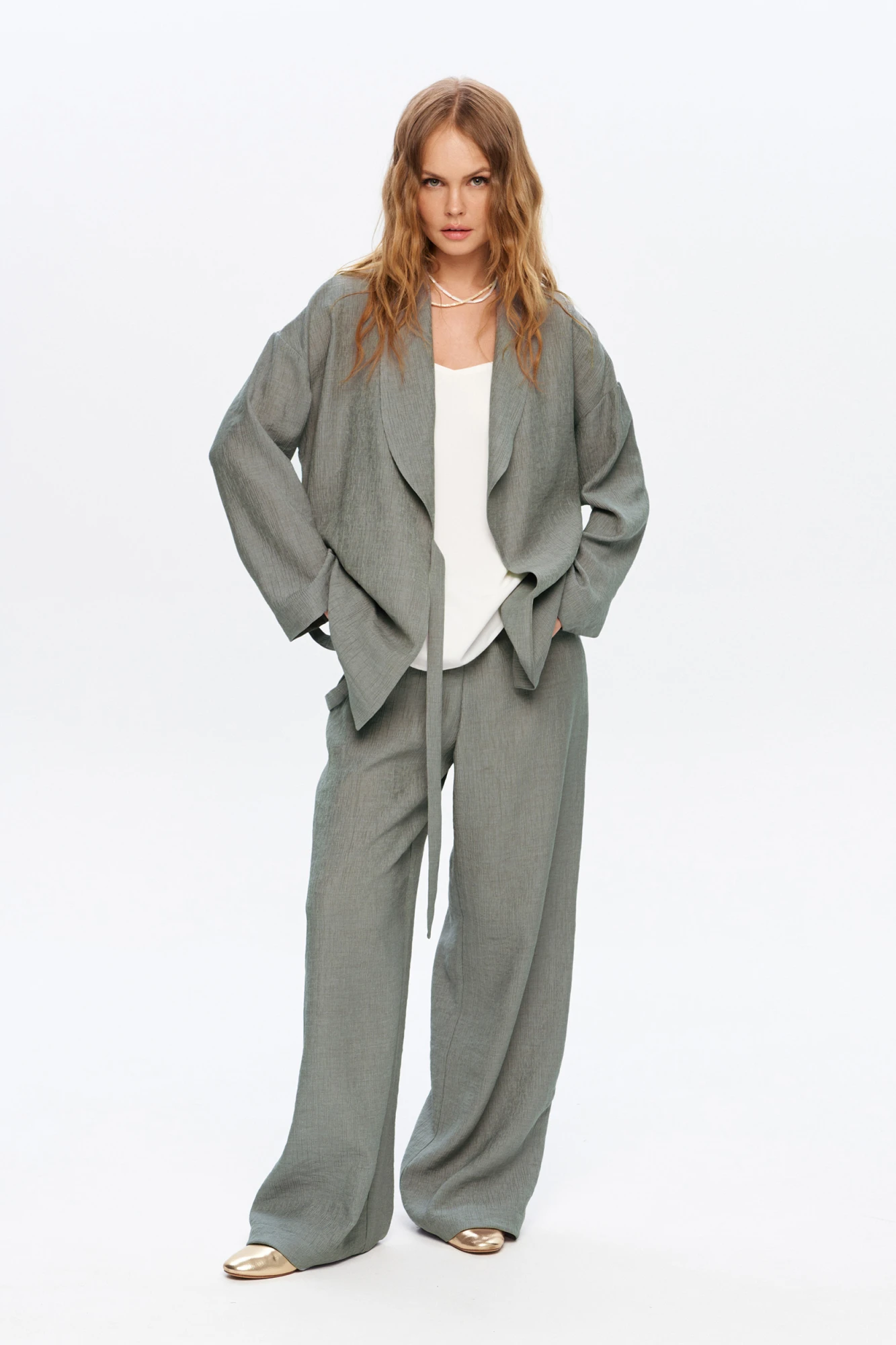 Детали: блуза полуприлегающего силуэта, свободный покрой, спущенная линия плеча, шалевый воротник, длинные широкие рукава с высокой подгибкой, карманы в боковых швах. Брюки с эластичным поясом и шнурами, без карманов.