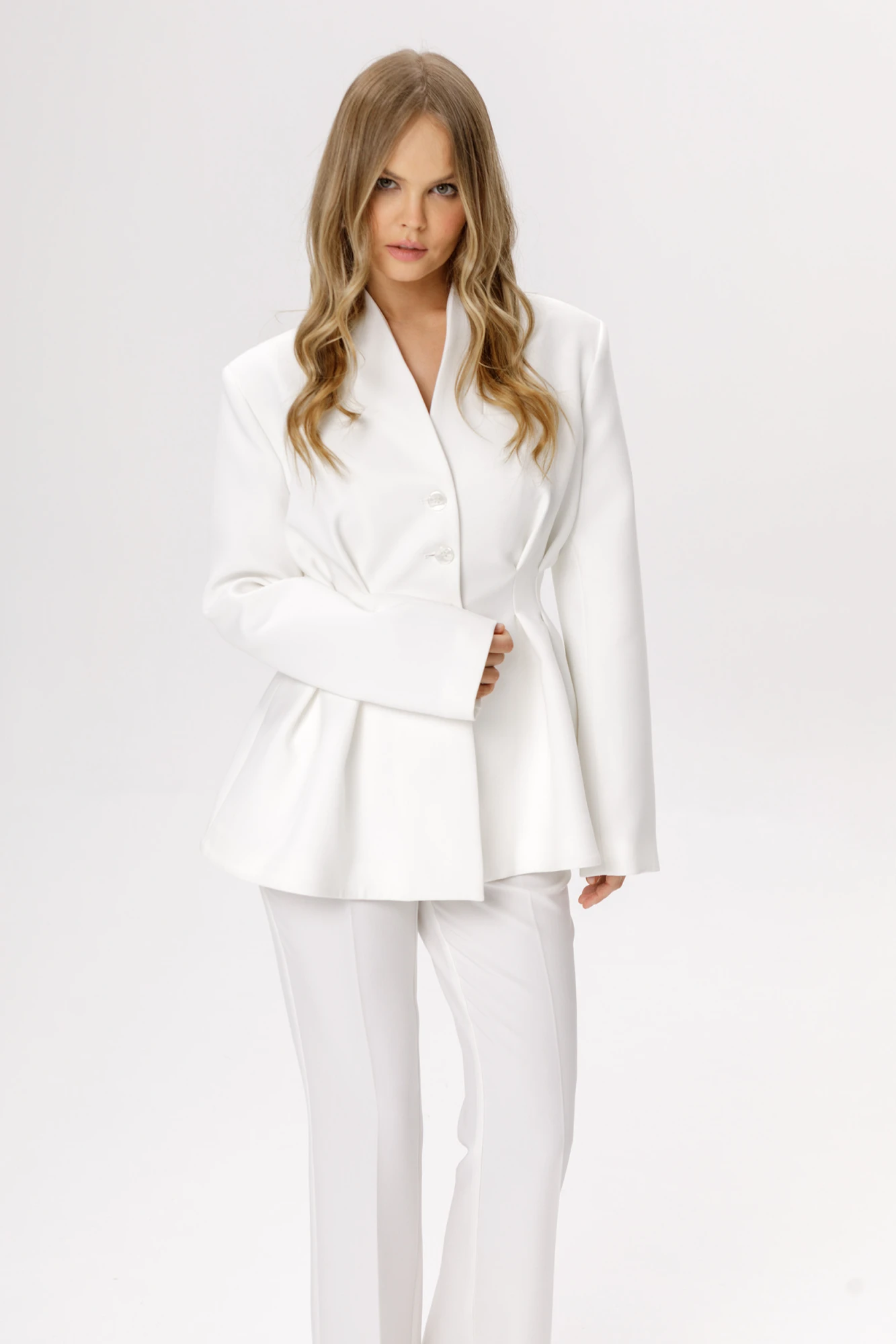 Детали: жакет полуприлегающего силуэта с расширенными плечами, цельнокроеный воротник-стойка, застежка на петли и пуговицы, рукава втачные двушхшовные, жакет на подкладке. Брюки с притачным поясом со шлевками, передние половины с заутюженными стрелками, застежка на молнию и потайные крючки, боковые карманы. Задние части брюк с вытачками и заутюженными стрелками. Пояс брюк без резинки.