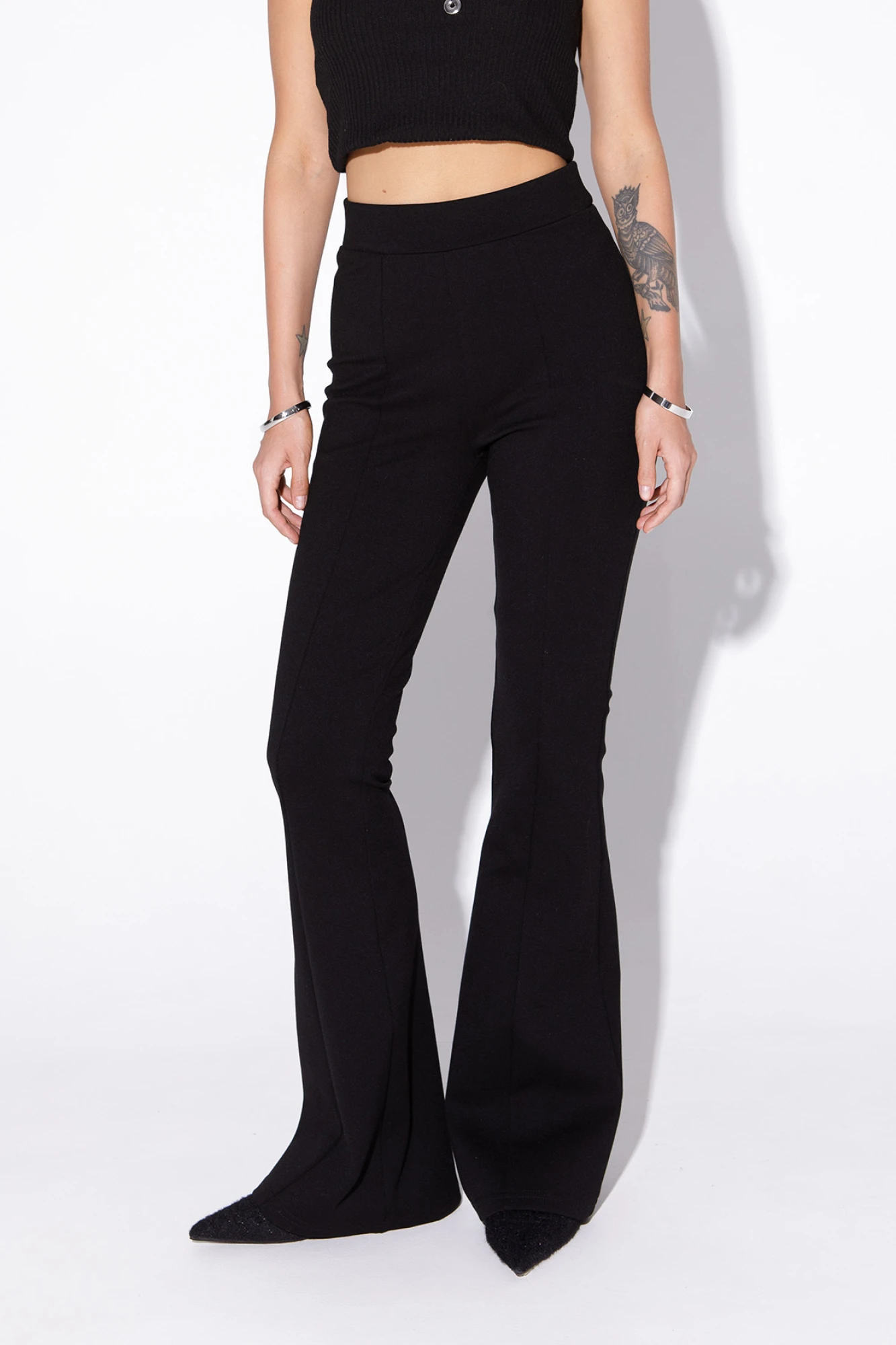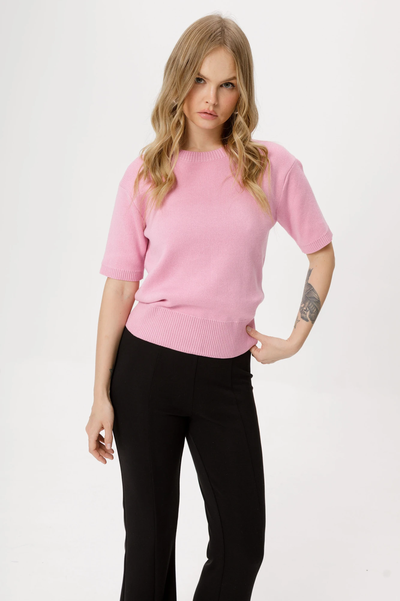 Детали: джемпер прямого силуэта с резинкой по низу, круглая грловина, рукава короткие. Брюки с высокой посадкой, перед с рельефными швами, пояс с резинкой, брюки без карманов.