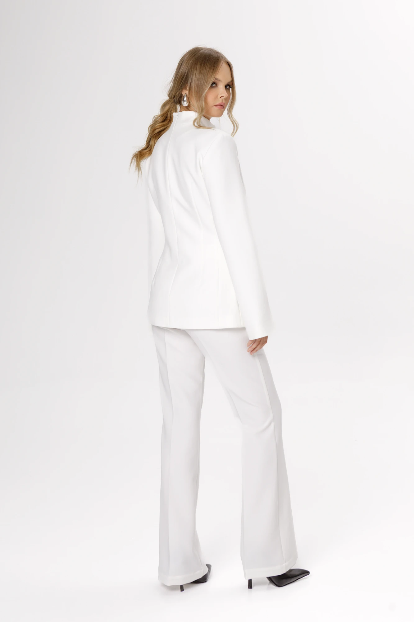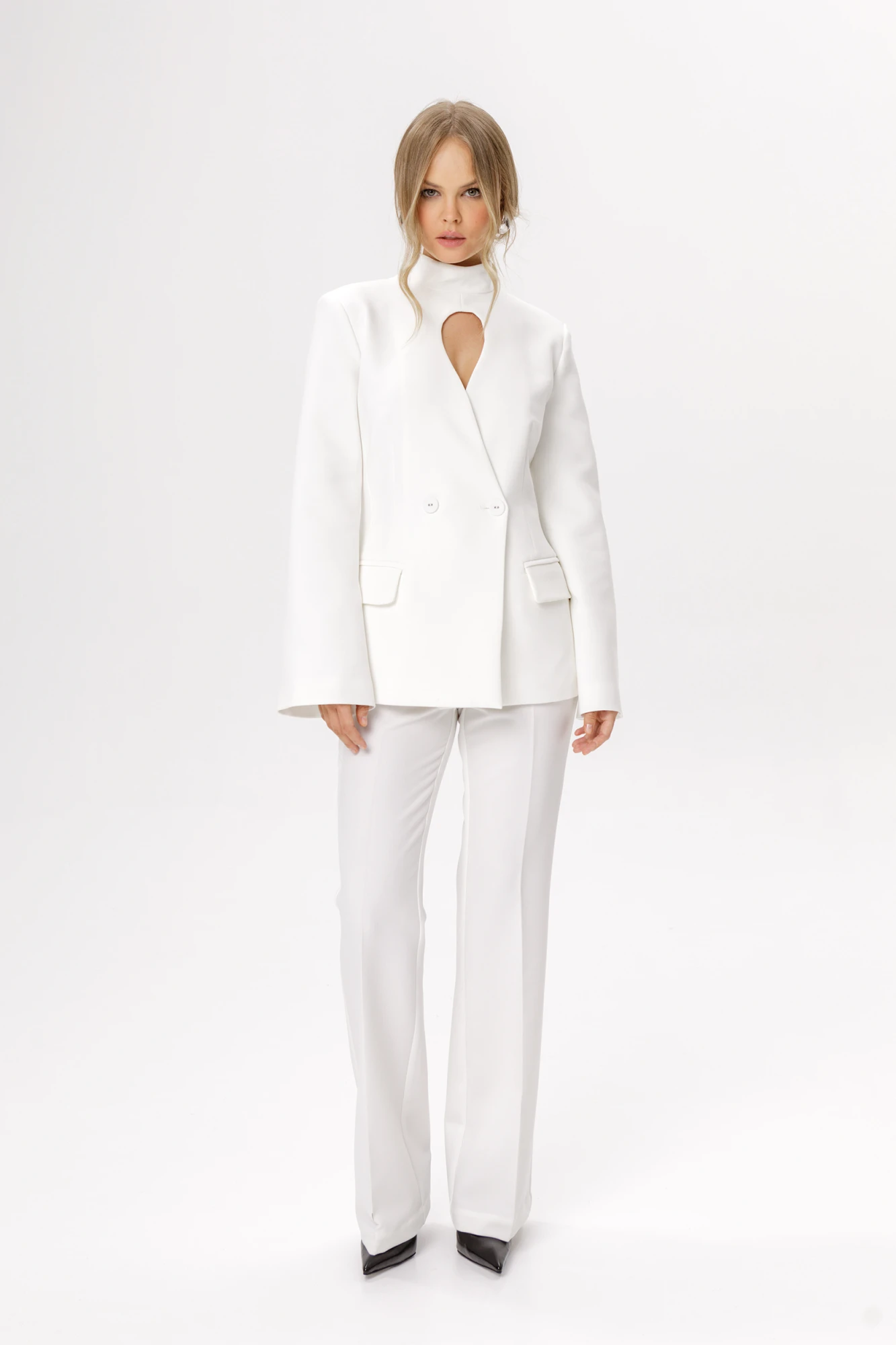 Детали: жакет полуприлегающего силуэта, фигурный вырез-капля по переду, воротник-стойка, потайная застежка по спинке, втачные широкие рукава, функциональные карманы, жакет на подкладке. Брюки с притачным поясом со шлевками, складки, застежка на молнию и пуговицу, боковые карманы. Задние части брюк с вытачками и имитацией карманов.