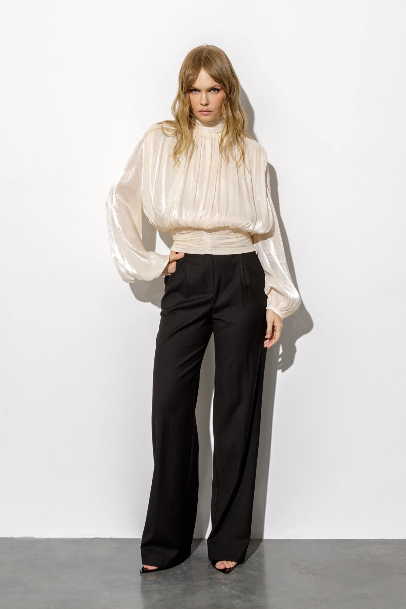 Детали: блуза приталенного силуэта, перед и спинка свободного покроя, пояс блузы со сборкой, расширенные плечи, сборки по плечам и горловине, застёжка на потайную молнию в боковом шве, воротник стойка со сборкой и застёжкой на навесные петли и пуговицы, втачные расширенные к низу рукава с резинкой по низу. Брюки с притачным поясом со шлевками, передние половины с небольшими застроченными мягкими складками и заутюженными стрелками, застежка на молнию и пуговицу, боковые карманы. Задние части брюк с вытачками и заутюженными стрелками. Пояс брюк прямой, без резинки.