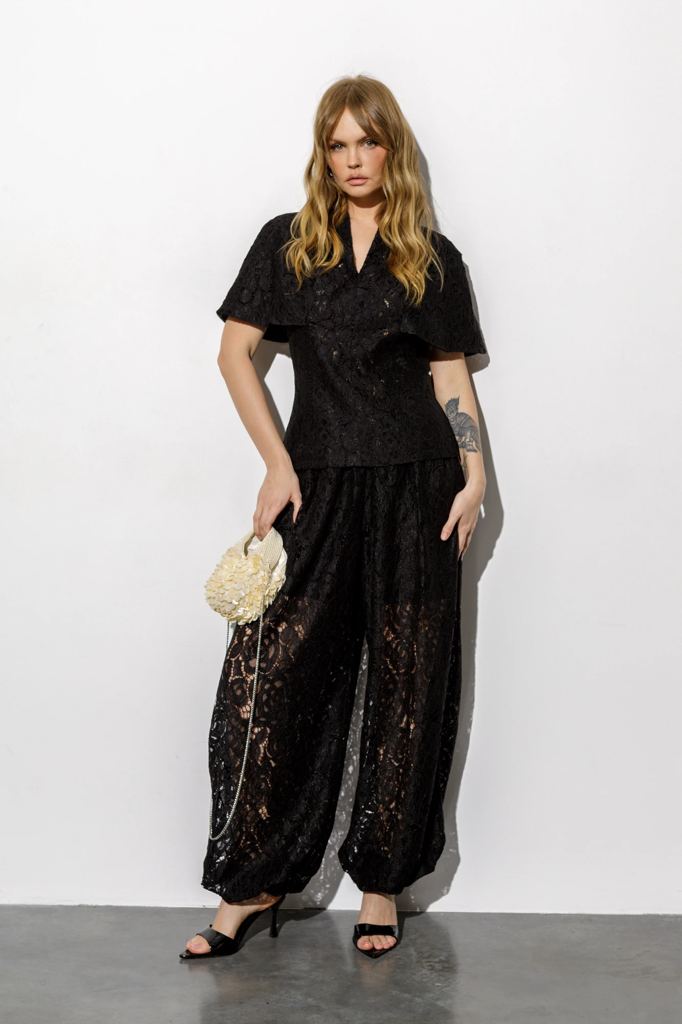 Детали: блуза прилегающего силуэта, талиевые вытачки по переду и спинке, цельнокроеная горловина стойка, потайная молния в среднем шве спинки, блуза на подкладке. Брюки с высокой посадкой на притачном эластичном поясе, без застежки, боковые карманы, низ брюк с эластичными манжетами, брюки на хлопковой подкладке.