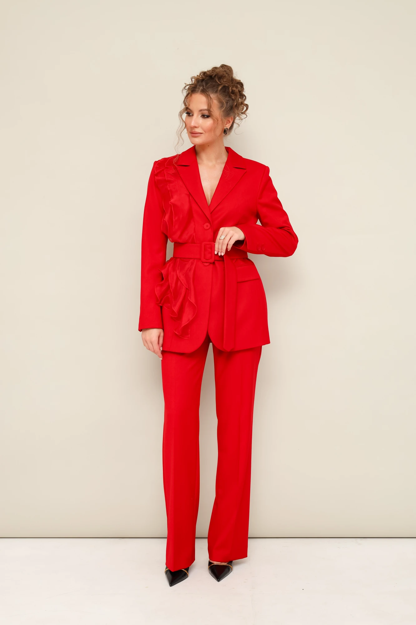Жакет полуприлегающего силуэта, с центральной застежкой на петли и пуговицы. Воротник пиджачного типа с отложными лацканами, край борта скругленный по низу жакета. Спереди прорезной карман в рамку с клапаном. По правой полочке обработан декоративный элемент в виде настрочных воланов. Рукава втачные, двухшовные с вытачными шлицами с пуговицами. Спинка с рельефами и средним швом, переходящим в шлицу. Жакет на подкладке.
