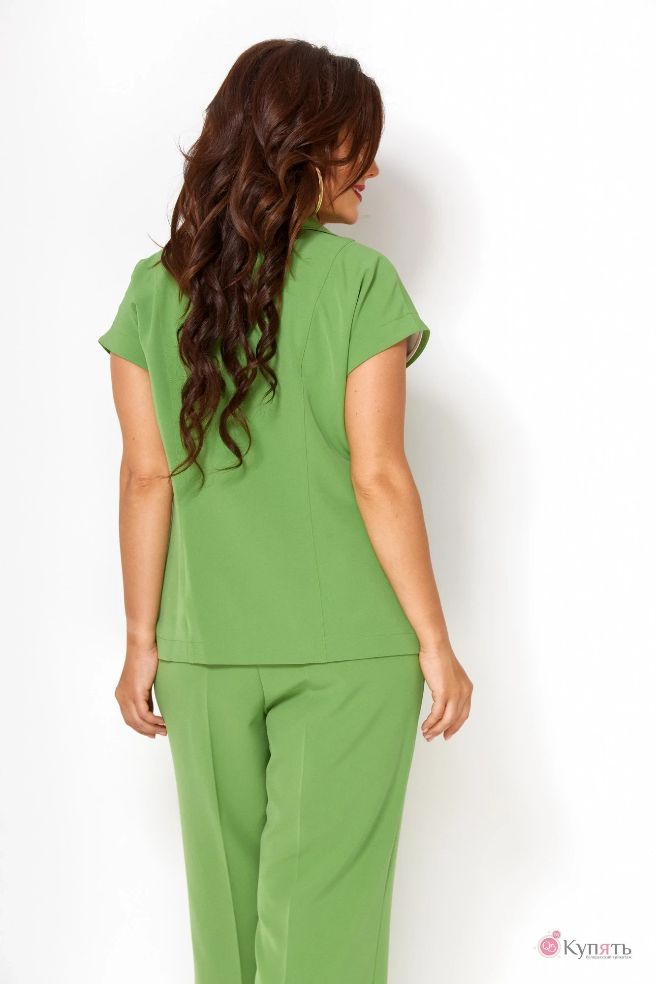 Костюм состоит из жакета и брюк, выполнен из однотонной ткани. Жакет полуприлегающего силуэта, длиной чуть ниже линии бедер. Жакет с застежками на один ряд петель и пуговиц, и воротником притачного типа. Полочка и спинка с рельефами от плечевого шва. Рукав цельнокроеннй, короткий. Брюки прямые, длинные, свободные в верхней части, со стрелками. По передним половинам выполнены карманы. Брюки на притачном поясе с эластичной тесьмой и завязками спереди.