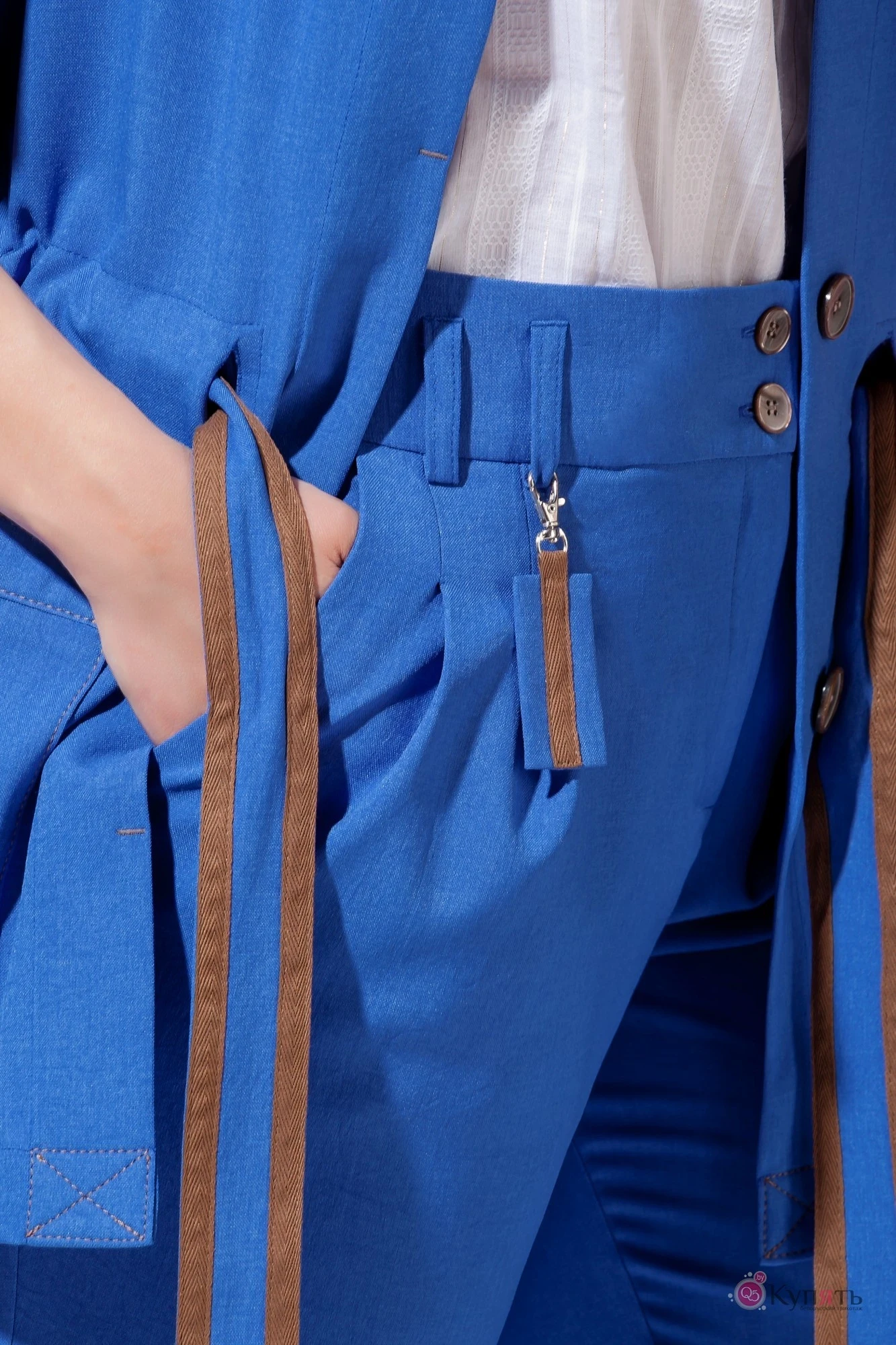 Женский жакет из костюмной ткани прямого силуэта с центральной потайной застежкой на петли и пуговицы. Горловина округлой формы. Линия плеча спущена, рукав короткий с манжетой, по переду обработаны накладные карманы и пояс на кулисе, спинка по линии талии на резинке. Брюки прямого кроя с 2 складками от пояса и с наклонными карманами, сзади карманы-листочки.