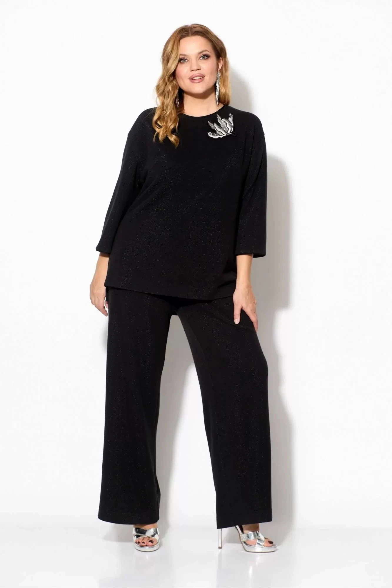 Комплект женский (джемпер и брюки). Джемпер женский, свободного силуэта, длиной ниже линии бедер, со спущенной линией плеча, с втачными рукавами, с разрезами в боковых швах, со съемным украшением. Деталь переда с нагрудными вытачками. Рукава втачные одношовные, длиной ¾. Низ обработан обтачкой, в шов обтачивания вставлен декоративный кант. Вырез горловины округлой формы, обработан обтачкой, с втачным декоративным кантом. Брюки на талии, плотно облегающие вверху и прямые к низу, с притачным поясом, в который вставлена эластичная тесьма. На передних половинках брюк в боковых швах обработаны карманы. Декор может отличаться от представленного на фотографии. Джемпер: длина спинки – 72см. Брюки: длина по боковому шву – 103см. Джемпер: длина рукава – 37см, ширина рукава – 23,5см.