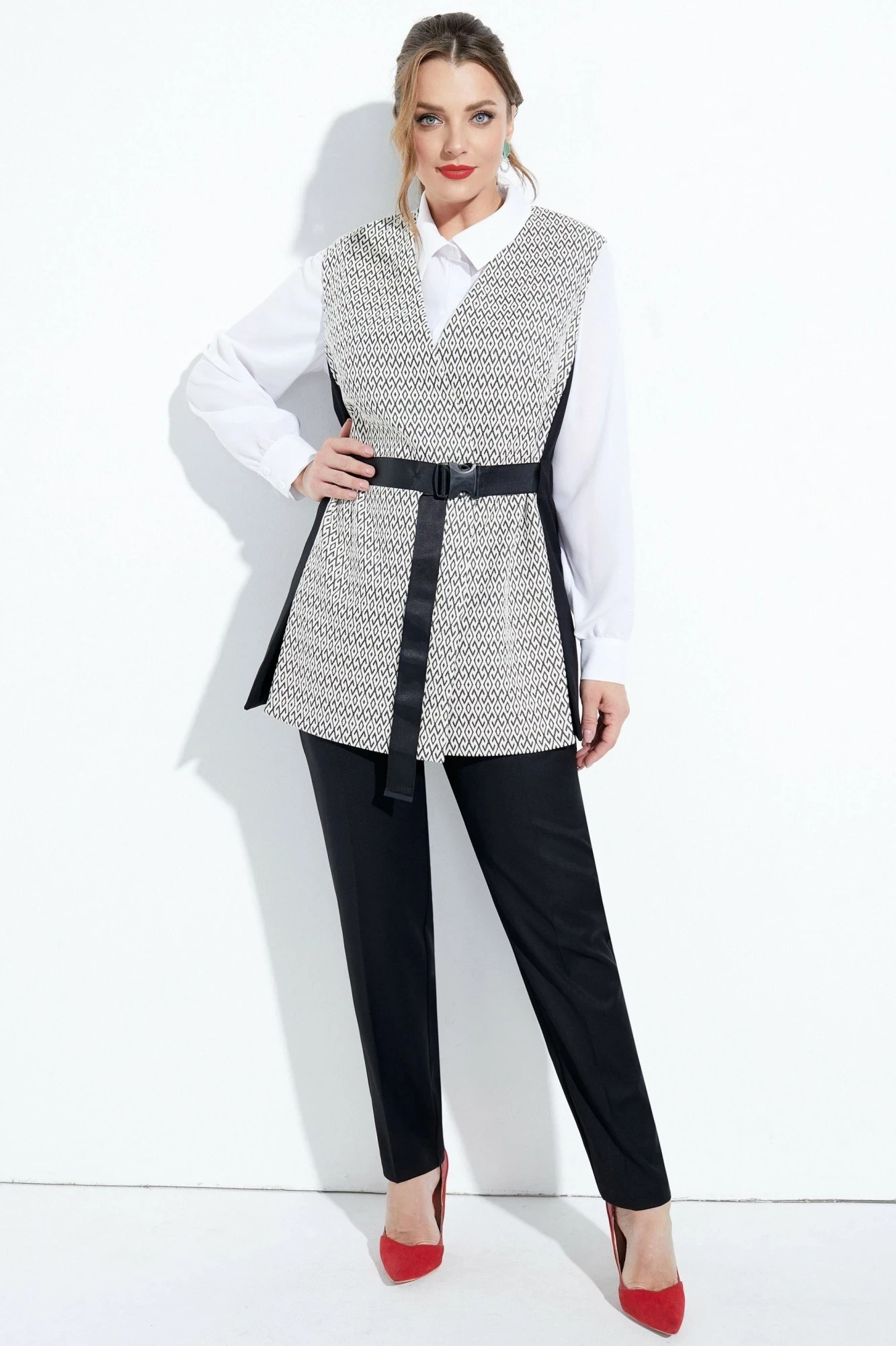 Дизайнерский брючный костюм с ультрастильным жилетом и трендовыми зауженными брюками отлично впишется в ваш гардероб. Жилет прямого силуэта с V-образным вырезом и комбинированной застежкой на пряжку с тесьмой и пуговицы. Перед оформлен вертикальными вытачками отрезными бочками с высокими разрезами. Спинка со средним швом и отрезными бочками. Дизайнерская белая рубашка с потайной застежкой отлично сочетается с разными вещами, один из элементов для создания капсульного гардероба. Блузка с рубашечным воротником на стойке прямого силуэта свободной формы. Спинка с горизонтальной кокеткой. Линия плеча приспущена, рукав втачной с манжетой по низу. Трендовые брюки средней посадки с косыми карманами и отрезным поясом ( по бокам на резинке). Застежка обработана по классической технологии (гульфик с молнией и пуговица на поясе). Жилет на подкладке.
